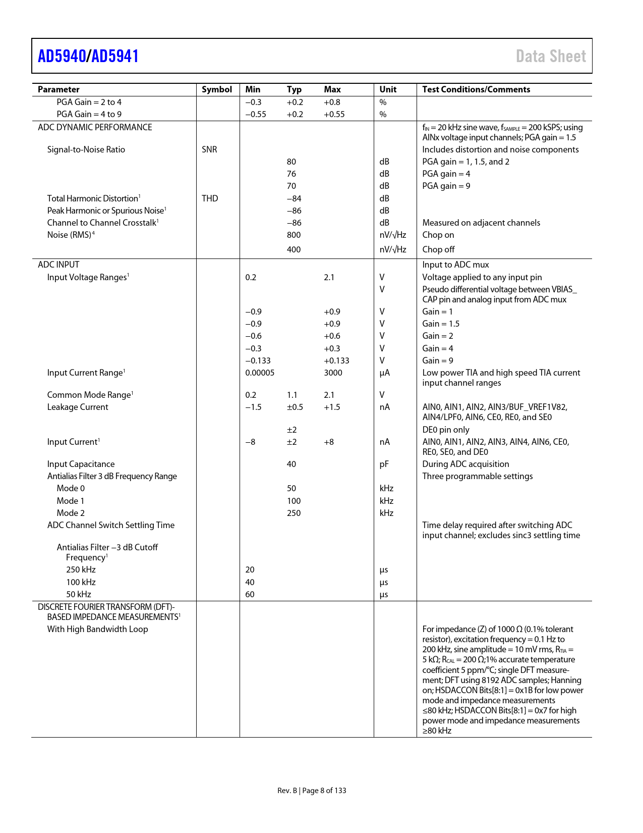 link to page 16 link to page 16 link to page 16 link to page 16 link to page 16 link to page 16 link to page 16 link to page 16 link to page 16 link to page 16 AD5940/AD5941Data SheetParameterSymbolMinTypMaxUnitTest Conditions/Comments PGA Gain = 2 to 4 −0.3 +0.2 +0.8 % PGA Gain = 4 to 9 −0.55 +0.2 +0.55 % ADC DYNAMIC PERFORMANCE fIN = 20 kHz sine wave, fSAMPLE = 200 kSPS; using AINx voltage input channels; PGA gain = 1.5 Signal-to-Noise Ratio SNR Includes distortion and noise components 80 dB PGA gain = 1, 1.5, and 2 76 dB PGA gain = 4 70 dB PGA gain = 9 Total Harmonic Distortion1 THD −84 dB Peak Harmonic or Spurious Noise1 −86 dB Channel to Channel Crosstalk1 −86 dB Measured on adjacent channels Noise (RMS)4 800 nV/√Hz Chop on 400 nV/√Hz Chop off ADC INPUT Input to ADC mux Input Voltage Ranges1 0.2 2.1 V Voltage applied to any input pin V Pseudo differential voltage between VBIAS_ CAP pin and analog input from ADC mux −0.9 +0.9 V Gain = 1 −0.9 +0.9 V Gain = 1.5 −0.6 +0.6 V Gain = 2 −0.3 +0.3 V Gain = 4 −0.133 +0.133 V Gain = 9 Input Current Range1 0.00005 3000 µA Low power TIA and high speed TIA current input channel ranges Common Mode Range1 0.2 1.1 2.1 V Leakage Current −1.5 ±0.5 +1.5 nA AIN0, AIN1, AIN2, AIN3/BUF_VREF1V82, AIN4/LPF0, AIN6, CE0, RE0, and SE0 ±2 DE0 pin only Input Current1 −8 ±2 +8 nA AIN0, AIN1, AIN2, AIN3, AIN4, AIN6, CE0, RE0, SE0, and DE0 Input Capacitance 40 pF During ADC acquisition Antialias Filter 3 dB Frequency Range Three programmable settings Mode 0 50 kHz Mode 1 100 kHz Mode 2 250 kHz ADC Channel Switch Settling Time Time delay required after switching ADC input channel; excludes sinc3 settling time Antialias Filter −3 dB Cutoff Frequency1 250 kHz 20 µs 100 kHz 40 µs 50 kHz 60 µs DISCRETE FOURIER TRANSFORM (DFT)- BASED IMPEDANCE MEASUREMENTS1 With High Bandwidth Loop For impedance (Z) of 1000 Ω (0.1% tolerant resistor), excitation frequency = 0.1 Hz to 200 kHz, sine amplitude = 10 mV rms, RTIA = 5 kΩ; RCAL = 200 Ω;1% accurate temperature coefficient 5 ppm/°C; single DFT measure- ment; DFT using 8192 ADC samples; Hanning on; HSDACCON Bits[8:1] = 0x1B for low power mode and impedance measurements ≤80 kHz; HSDACCON Bits[8:1] = 0x7 for high power mode and impedance measurements ≥80 kHz Rev. B | Page 8 of 133 Document Outline FEATURES APPLICATIONS SIMPLIFIED BLOCK DIAGRAM TABLE OF CONTENTS REVISION HISTORY FUNCTIONAL BLOCK DIAGRAM GENERAL DESCRIPTION SPECIFICATIONS ADC RMS NOISE SPECIFICATIONS ADC RMS Noise: Digital Filter Settings ADC RMS Noise: Peak-to-Peak Effective Bits SPI TIMING SPECIFICATIONS SPI Timing Diagram ABSOLUTE MAXIMUM RATINGS THERMAL RESISTANCE ESD CAUTION PIN CONFIGURATION AND FUNCTION DESCRIPTIONS TYPICAL PERFORMANCE CHARACTERISTICS REFERENCE TEST CIRCUIT THEORY OF OPERATION CONFIGURATION REGISTERS Configuration Register—AFECON Power Mode Configuration Register—PMBW SILICON IDENTIFICATION IDENTIFICATION REGISTERS Analog Devices, Inc., Identification Register—ADIID Chip Identification Register—CHIPID SYSTEM INITIALIZATION LOW POWER DAC LOW POWER DAC SWITCH OPTIONS RELATIONSHIP BETWEEN THE 12-BIT AND 6-BIT OUTPUTS LOW POWER DAC USE CASES Electrochemical Amperometric Measurement Electrochemical Impedance Spectroscopy Low Power DAC in 4-Wire Isolated Impedance Measurements LOW POWER DAC CIRCUIT REGISTERS LPDACCON0 Register—LPDACCON0 Low Power DAC Switch Control Register—LPDACSW0 Low Power DAC Data Output Register—LPDACDAT0 Low Power Reference Control Register—LPREFBUFCON Common-Mode Switch Mux Register—SWMUX LOW POWER POTENTIOSTAT LOW POWER TIA LOW POWER TIA PROTECTION DIODES Current-Limit Feature of the Low Power TIA and Potentiostat amplifier Low Power TIA Force/Sense Feature USING AN EXTERNAL RTIA RECOMMENDED SWITCH SETTINGS FOR VARIOUS OPERATING MODES LOW POWER TIA CIRCUITS REGISTERS Low Power TIA Switch Configuration Register—LPTIASW0 Low Power TIA Control Bits, Channel 0 Register—LPTIACON0 HIGH SPEED DAC CIRCUITS HIGH SPEED DAC OUTPUT SIGNAL GENERATION POWER MODES OF THE HIGH SPEED DAC CORE Low Power Mode High Power Mode Hibernate Mode HIGH SPEED DAC FILTER OPTIONS HIGH SPEED DAC OUTPUT ATTENUATION OPTIONS HIGH SPEED DAC EXCITATION AMPLIFIER COUPLING AN AC SIGNAL FROM THE HIGH SPEED DAC TO THE DC LEVEL SET BY THE LOW POWER DAC AVOIDING INCOHERENCY ERRORS BETWEEN EXCITATION AND MEASUREMENT FREQUENCIES DURING IMPEDANCE MEASUREMENTS HIGH SPEED DAC CALIBRATION OPTIONS HIGH SPEED DAC CIRCUIT REGISTERS High Speed DAC Configuration Register—HSDACCON High Speed DAC Code Register—HSDACDAT Calibration Data Lock Register—CALDATLOCK DAC Gain Register—DACGAIN DAC Offset with Attenuator Enabled (Low Power Mode) Register—DACOFFSETATTEN DAC Offset with Attenuator Disabled (Low Power Mode Register)—DACOFFSET DAC Offset with Attenuator Enabled (High Speed Mode Register)—DACOFFSETATTENHS DAC Offset with Attenuator Disabled (High Speed Mode Register)—DACOFFSETHS HIGH SPEED TIA CIRCUITS HIGH SPEED TIA CONFIGURATION Input Signal Selection Gain Resistor Selection Load Resistor Selection Common-Mode Voltage Selection External RTIA Selection HIGH SPEED TIA CIRCUIT REGISTERS High Speed RTIA Configuration Register—HSRTIACON DE0 High Speed TIA Resistors Configuration Register—DE0RESCON High Speed TIA Configuration Register—HSTIACON HIGH PERFORMANCE ADC CIRCUIT ADC CIRCUIT OVERVIEW ADC CIRCUIT DIAGRAM ADC CIRCUIT FEATURES ADC CIRCUIT OPERATION ADC TRANSFER FUNCTION ADC LOW POWER CURRENT INPUT CHANNEL SELECTING INPUTS TO ADC MUX ADC POSTPROCESSING Sinc3 Filter INTERNAL TEMPERATURE SENSOR CHANNEL SINC2 FILTER (50 HZ/60 HZ MAINS FILTER) ADC CALIBRATION ADC CIRCUIT REGISTERS ADC Output Filters Configuration Register—ADCFILTERCON ADC Raw Result Register—ADCDAT DFT Result, Real Device Register—DFTREAL DFT Result, Imaginary Device Register—DFTIMAG Sinc2 Filter Result Register—SINC2DAT Temperature Sensor Result Register—TEMPSENSDAT DFT Configuration Register—DFTCON Temperatur