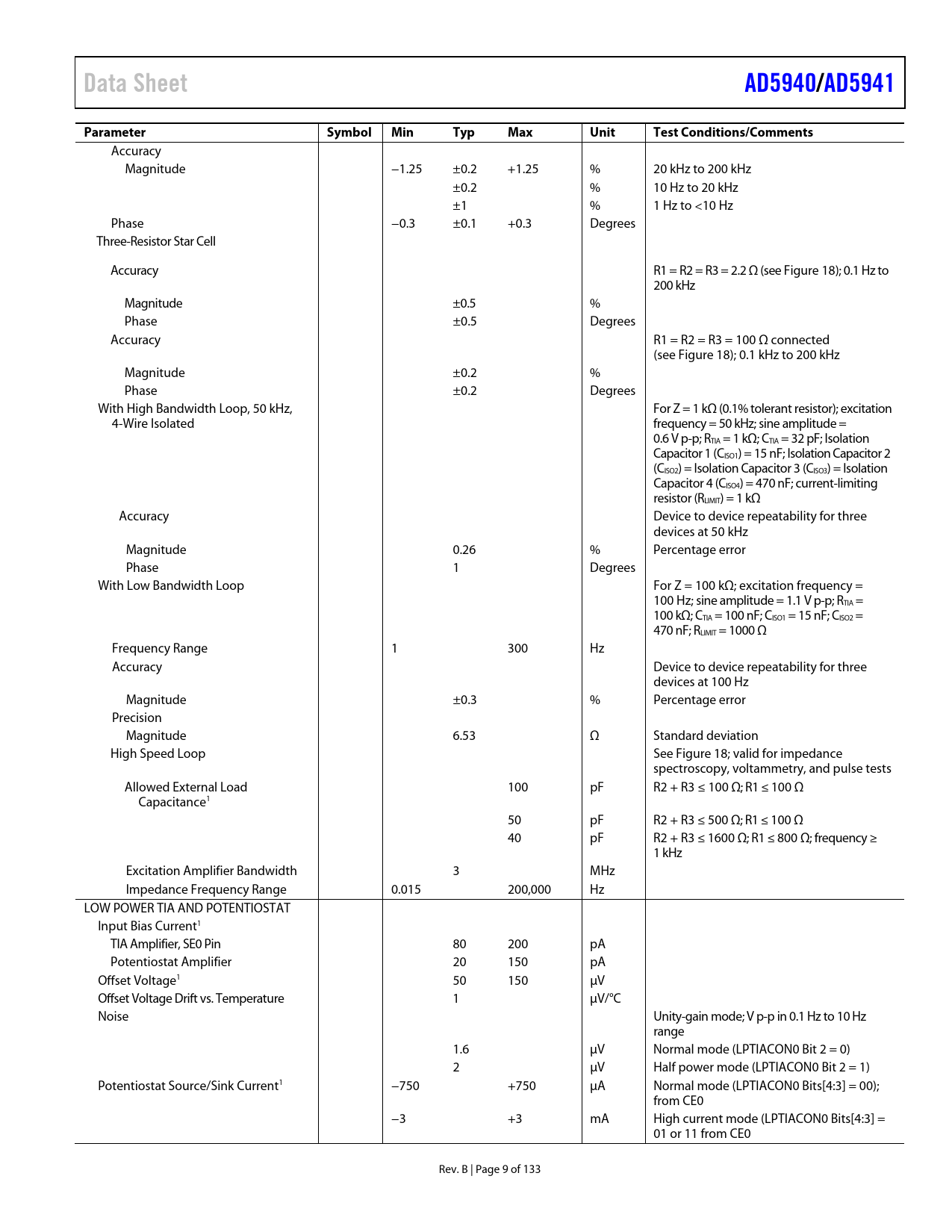 Pages / Page133 / 9 — Data Sheet. AD5940/. AD5941. Parameter. Symbol. Min. Typ. Max. Unit. Test …