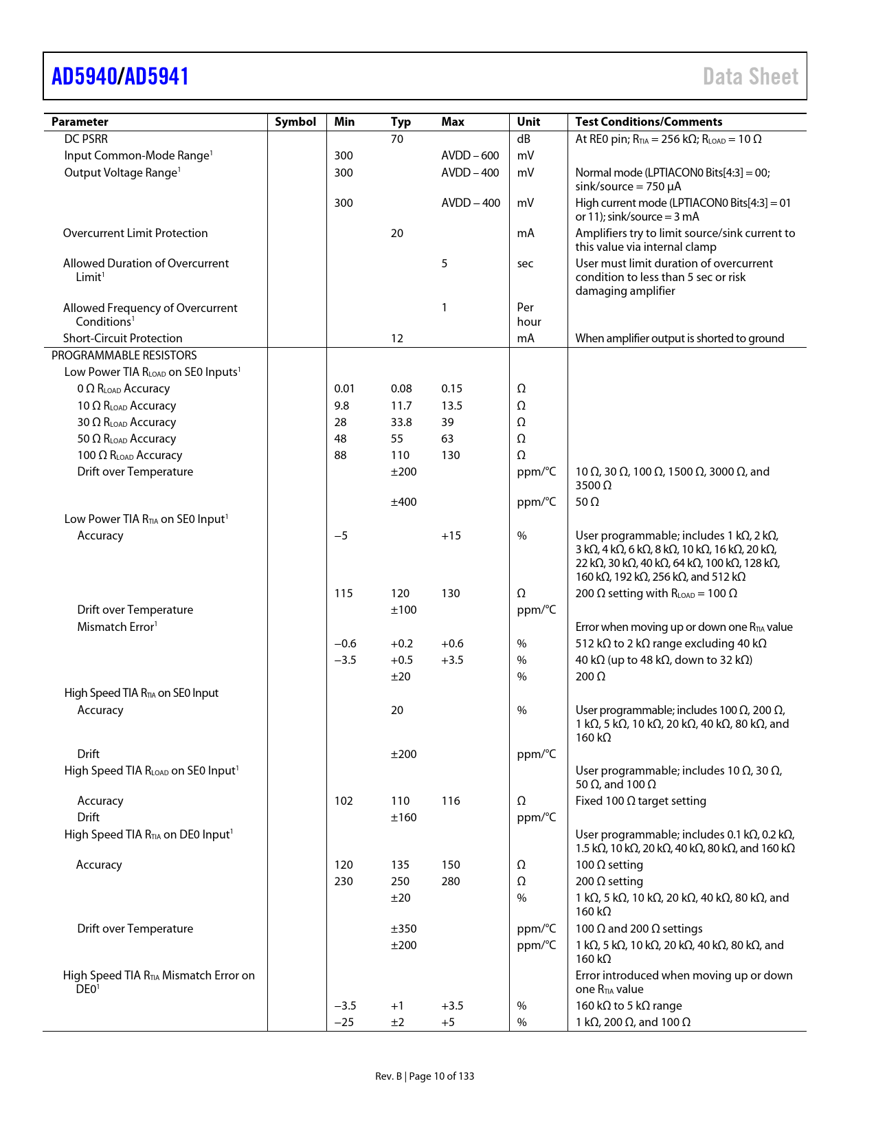 Pages / Page133 / 10 — AD5940. /AD5941. Data Sheet. Parameter. Symbol. Min. Typ. Max. Unit. Test …