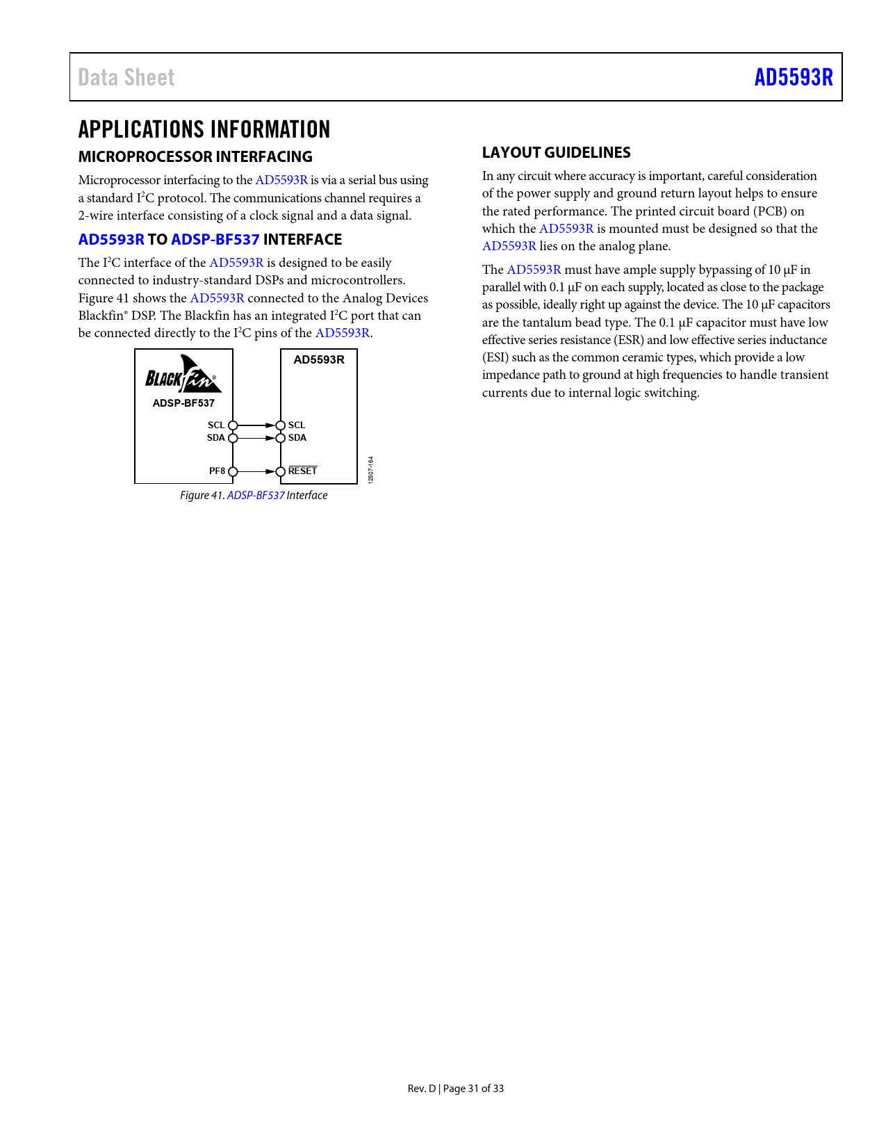Data Sheet AD5593R APPLICATIONS INFORMATION MICROPROCESSOR INTERFACING LAYOUT GUIDELINES AD5593R TO ADSP-BF537 INTERFA