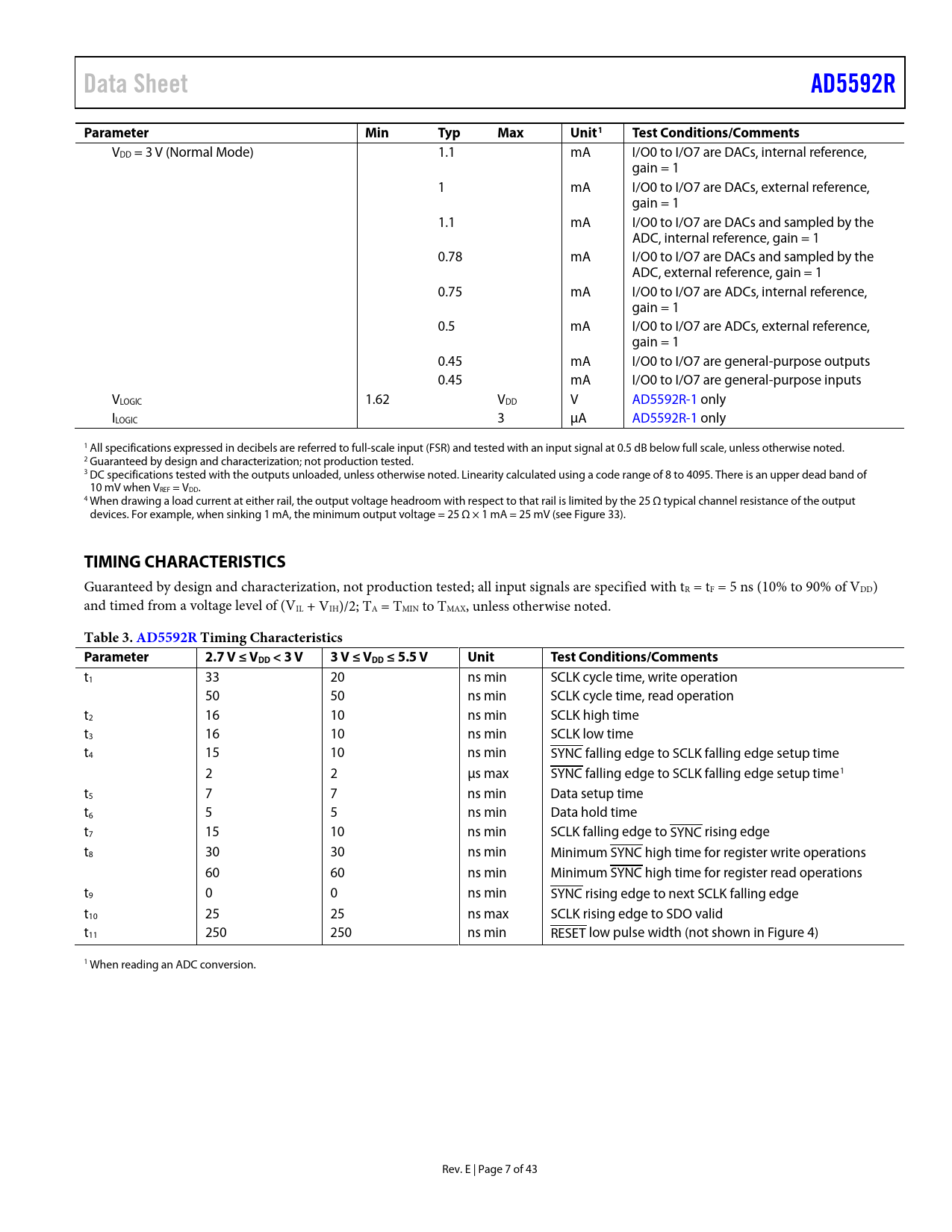 VDD = 3 V (Normal Mode) 1.1 mA I/O0 to I/O7 are DACs, internal reference, gain = 1 1 mA I/O0 to I/O7 are DACs, external reference, gain = 1 1.1 mA I/O0 to I/O7 are DACs and sampled by the ADC, internal reference, gain = 1 0.78 mA I/O0 to I/O7 are DACs and sampled by the ADC, external reference, gain = 1 0.75 mA I/O0 to I/O7 are ADCs, internal reference, gain = 1 0.5 mA I/O0 to I/O7 are ADCs, external reference, gain = 1 0.45 mA I/O0 to I/O7 are general-purpose outputs 0.45 mA I/O0 to I/O7 are general-purpose inputs VLOGIC 1.62 VDD V AD5592R-1 only ILOGIC 3 µA AD5592R-1 only 1 All specifications expressed in decibels are referred to full-scale input (FSR) and tested with an input signal at 0.5 dB below ful scale, unless otherwise noted. 2 Guaranteed by design and characterization; not production tested. 3 DC specifications tested with the outputs unloaded, unless otherwise noted. Linearity calculated using a code range of 8 to 4095. There is an upper dead band of 10 mV when VREF = VDD. 4 When drawing a load current at either rail, the output voltage headroom with respect to that rail is limited by the 25 Ω typical channel resistance of the output devices. For example, when sinking 1 mA, the minimum output voltage = 25 Ω × 1 mA = 25 mV (see Figure 33).