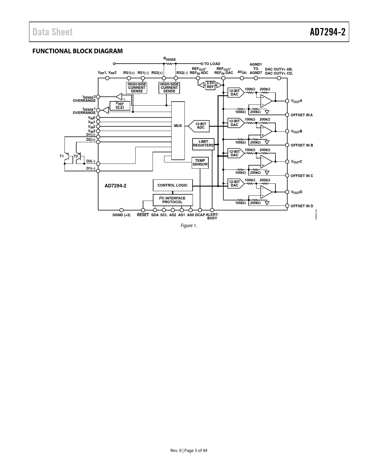 Data SheetAD7294-2FUNCTIONAL BLOCK DIAGRAMRSENSETO LOADAGND1REFREFOUT/OUT/TODAC OUTV+ AB,VPP1, VPP2RS1(+) RS1(–) RS2(+)RS2(–) REFREFAVIN ADCIN DACDDAGND7 DAC OUTV+ CD,HIGH-SIDEHIGH-SIDE2.5VCURRENTCURRENTREF100kΩ 200kΩSENSESENSE12-BITDACISENSE2OVERRANGEVVOUTAREF10.41ISENSE1OVERRANGE100kΩ 200kΩOFFSET IN AVIN0100kΩ 200kΩV12-BITIN112-BITDACVMUXIN2ADCVIN3VOUTBD1(+) D2(+)LIMIT100kΩ 200kΩREGISTERSOFFSET IN B100kΩ 200kΩ12-BITT1T2DACD2(–)TEMPVSENSOROUTCD1(–)100kΩ 200kΩOFFSET IN C100kΩ 200kΩ12-BITCONTROL LOGICAD7294-2DACVOUTDI2C INTERFACEPROTOCOL100kΩ 200kΩOFFSET IN D 001 DGND (×3)RESET SDA SCL AS2 AS1 AS0 DCAP ALERT/BUSY 10936- Figure 1. Rev. 0 | Page 3 of 44 Document Outline Features Applications General Description Table of Contents Revision History Functional Block Diagram Specifications DAC Specifications ADC Specifications General Specifications Timing Characteristics I2C Serial Interface Timing and Circuit Diagrams Absolute Maximum Ratings Thermal Resistance ESD Caution Pin Configuration and Function Descriptions Typical Performance Characteristics Terminology DAC Terminology ADC Terminology Theory of Operation ADC Overview ADC Transfer Functions Analog Inputs Single-Ended Mode Differential Mode Driving Differential Inputs Using an Op Amp Pair Pseudo Differential Mode Current Sensor Choosing RSENSE Current Sense Filtering Kelvin Sense Resistor Connection Analog Comparator Loop Temperature Sensor Remote Sensing Diode Ideality Factor Base Emitter Voltage hFE Variation Series Resistance Cancellation DAC Operation Resistor String Output Amplifiers ADC and DAC Reference VDRIVE Feature Register Settings Address Pointer Register Command Register ADC Result Register ADC Channel Allocation TSENSE1 and TSENSE2 Result Registers TSENSEINT Result Register Temperature Value Format DACA, DACB, DACC, and DACD Value Registers Alert Status Register A, Alert Status Register B, and Alert Status Register C Channel Sequence Register Configuration Register Sample Delay and Bit Trial Delay Power-Down Register DATALOW and DATAHIGH Registers VIN0 to VIN3 Channels TSENSE1, TSENSE2, and TSENSEINT Channels Hysteresis Registers Remote Channel TSENSE1 and TSENSE2 Offset Registers I2C Interface General I2C Timing Serial Bus Address Byte Interface Protocol Writing a Single Byte of Data to an 8-Bit Register Writing Two Bytes of Data to a 16-Bit Register Writing to Multiple Registers Reading Data from an 8-Bit Register Reading Two Bytes of Data from a 16-Bit Register Modes of Operation Command Mode Autocycle Mode Alerts and Limits Theory ALERT_FLAG Bit Alert Status Registers DATALOW and DATAHIGH Monitoring Features Hysteresis Using the Limit Registers to Store Minimum/Maximum Conversion Results Applications Information Base Station Power Amplifier Monitor and Control Gain Control of Power Amplifier Outline Dimensions Ordering Guide