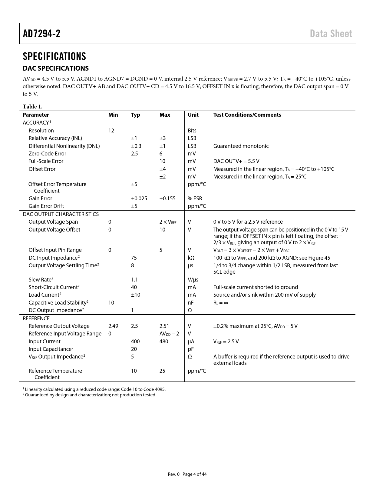 link to page 23 link to page 4 link to page 4 link to page 4 link to page 4 link to page 4 link to page 4 link to page 4 link to page 4 link to page 5 link to page 5 link to page 4 link to page 4 link to page 4 AD7294-2Data SheetSPECIFICATIONS DAC SPECIFICATIONS AVDD = 4.5 V to 5.5 V, AGND1 to AGND7 = DGND = 0 V, internal 2.5 V reference; VDRIVE = 2.7 V to 5.5 V; TA = −40°C to +105°C, unless otherwise noted. DAC OUTV+ AB and DAC OUTV+ CD = 4.5 V to 16.5 V; OFFSET IN x is floating; therefore, the DAC output span = 0 V to 5 V. Table 1. ParameterMinTypMaxUnitTest Conditions/Comments ACCURACY1 Resolution 12 Bits Relative Accuracy (INL) ±1 ±3 LSB Differential Nonlinearity (DNL) ±0.3 ±1 LSB Guaranteed monotonic Zero-Code Error 2.5 6 mV Full-Scale Error 10 mV DAC OUTV+ = 5.5 V Offset Error ±4 mV Measured in the linear region, TA = −40°C to +105°C ±2 mV Measured in the linear region, TA = 25°C Offset Error Temperature ±5 ppm/°C Coefficient Gain Error ±0.025 ±0.155 % FSR Gain Error Drift ±5 ppm/°C DAC OUTPUT CHARACTERISTICS Output Voltage Span 0 2 × VREF V 0 V to 5 V for a 2.5 V reference Output Voltage Offset 0 10 V The output voltage span can be positioned in the 0 V to 15 V range; if the OFFSET IN x pin is left floating, the offset = 2/3 × VREF, giving an output of 0 V to 2 × VREF Offset Input Pin Range 0 5 V VOUT = 3 × VOFFSET − 2 × VREF + VDAC DC Input Impedance2 75 kΩ 100 kΩ to VREF, and 200 kΩ to AGND; see Figure 45 Output Voltage Settling Time2 8 µs 1/4 to 3/4 change within 1/2 LSB, measured from last SCL edge Slew Rate2 1.1 V/µs Short-Circuit Current2 40 mA Full-scale current shorted to ground Load Current2 ±10 mA Source and/or sink within 200 mV of supply Capacitive Load Stability2 10 nF RL = ∞ DC Output Impedance2 1 Ω REFERENCE Reference Output Voltage 2.49 2.5 2.51 V ±0.2% maximum at 25°C, AVDD = 5 V Reference Input Voltage Range 0 AVDD − 2 V Input Current 400 480 µA VREF = 2.5 V Input Capacitance2 20 pF VREF Output Impedance2 5 Ω A buffer is required if the reference output is used to drive external loads Reference Temperature 10 25 ppm/°C Coefficient 1 Linearity calculated using a reduced code range: Code 10 to Code 4095. 2 Guaranteed by design and characterization; not production tested. Rev. 0 | Page 4 of 44 Document Outline Features Applications General Description Table of Contents Revision History Functional Block Diagram Specifications DAC Specifications ADC Specifications General Specifications Timing Characteristics I2C Serial Interface Timing and Circuit Diagrams Absolute Maximum Ratings Thermal Resistance ESD Caution Pin Configuration and Function Descriptions Typical Performance Characteristics Terminology DAC Terminology ADC Terminology Theory of Operation ADC Overview ADC Transfer Functions Analog Inputs Single-Ended Mode Differential Mode Driving Differential Inputs Using an Op Amp Pair Pseudo Differential Mode Current Sensor Choosing RSENSE Current Sense Filtering Kelvin Sense Resistor Connection Analog Comparator Loop Temperature Sensor Remote Sensing Diode Ideality Factor Base Emitter Voltage hFE Variation Series Resistance Cancellation DAC Operation Resistor String Output Amplifiers ADC and DAC Reference VDRIVE Feature Register Settings Address Pointer Register Command Register ADC Result Register ADC Channel Allocation TSENSE1 and TSENSE2 Result Registers TSENSEINT Result Register Temperature Value Format DACA, DACB, DACC, and DACD Value Registers Alert Status Register A, Alert Status Register B, and Alert Status Register C Channel Sequence Register Configuration Register Sample Delay and Bit Trial Delay Power-Down Register DATALOW and DATAHIGH Registers VIN0 to VIN3 Channels TSENSE1, TSENSE2, and TSENSEINT Channels Hysteresis Registers Remote Channel TSENSE1 and TSENSE2 Offset Registers I2C Interface General I2C Timing Serial Bus Address Byte Interface Protocol Writing a Single Byte of Data to an 8-Bit Register Writing Two Bytes of Data to a 16-Bit Register Writing to Multiple Registers Reading Data from an 8-Bit Register Reading Two Bytes of Data from a 16-Bit Register Modes of Operation Command Mode Autocycle Mode Alerts and Limits Theory ALERT_FLAG Bit Alert Status Registers DATALOW and DATAHIGH Monitoring Features Hysteresis Using the Limit Registers to Store Minimum/Maximum Conversion Results Applications Information Base Station Power Amplifier Monitor and Control Gain Control of Power Amplifier Outline Dimensions Ordering Guide