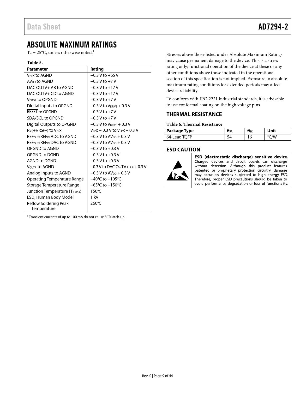 Data Sheet AD7294-2 ABSOLUTE MAXIMUM RATINGS Table 5 Parameter Rating THERMAL RESISTANCE Table 6 Thermal Resistance