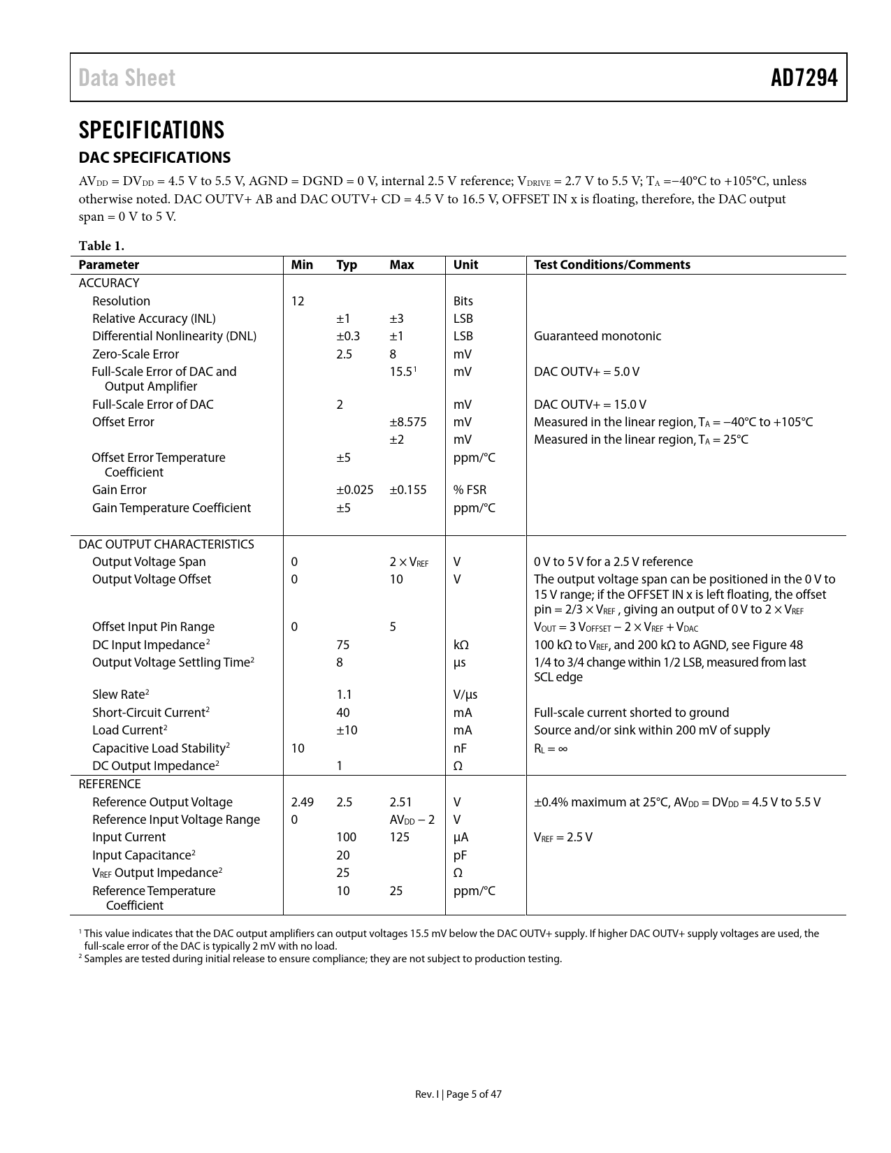 link to page 25 Data SheetAD7294SPECIFICATIONS DAC SPECIFICATIONS AVDD = DVDD = 4.5 V to 5.5 V, AGND = DGND = 0 V, internal 2.5 V reference; VDRIVE = 2.7 V to 5.5 V; TA =−40°C to +105°C, unless otherwise noted. DAC OUTV+ AB and DAC OUTV+ CD = 4.5 V to 16.5 V, OFFSET IN x is floating, therefore, the DAC output span = 0 V to 5 V. Table 1. ParameterMinTypMaxUnitTest Conditions/Comments ACCURACY Resolution 12 Bits Relative Accuracy (INL) ±1 ±3 LSB Differential Nonlinearity (DNL) ±0.3 ±1 LSB Guaranteed monotonic Zero-Scale Error 2.5 8 mV Full-Scale Error of DAC and 15.51 mV DAC OUTV+ = 5.0 V Output Amplifier Full-Scale Error of DAC 2 mV DAC OUTV+ = 15.0 V Offset Error ±8.575 mV Measured in the linear region, TA = −40°C to +105°C ±2 mV Measured in the linear region, TA = 25°C Offset Error Temperature ±5 ppm/°C Coefficient Gain Error ±0.025 ±0.155 % FSR Gain Temperature Coefficient ±5 ppm/°C DAC OUTPUT CHARACTERISTICS Output Voltage Span 0 2 × VREF V 0 V to 5 V for a 2.5 V reference Output Voltage Offset 0 10 V The output voltage span can be positioned in the 0 V to 15 V range; if the OFFSET IN x is left floating, the offset pin = 2/3 × VREF , giving an output of 0 V to 2 × VREF Offset Input Pin Range 0 5 VOUT = 3 VOFFSET − 2 × VREF + VDAC DC Input Impedance2 75 kΩ 100 kΩ to VREF, and 200 kΩ to AGND, see Figure 48 Output Voltage Settling Time2 8 µs 1/4 to 3/4 change within 1/2 LSB, measured from last SCL edge Slew Rate2 1.1 V/µs Short-Circuit Current2 40 mA Full-scale current shorted to ground Load Current2 ±10 mA Source and/or sink within 200 mV of supply Capacitive Load Stability2 10 nF RL = ∞ DC Output Impedance2 1 Ω REFERENCE Reference Output Voltage 2.49 2.5 2.51 V ±0.4% maximum at 25°C, AVDD = DVDD = 4.5 V to 5.5 V Reference Input Voltage Range 0 AVDD − 2 V Input Current 100 125 µA VREF = 2.5 V Input Capacitance2 20 pF VREF Output Impedance2 25 Ω Reference Temperature 10 25 ppm/°C Coefficient 1 This value indicates that the DAC output amplifiers can output voltages 15.5 mV below the DAC OUTV+ supply. If higher DAC OUTV+ supply voltages are used, the full-scale error of the DAC is typically 2 mV with no load. 2 Samples are tested during initial release to ensure compliance; they are not subject to production testing. Rev. I | Page 5 of 47 Document Outline FEATURES APPLICATIONS GENERAL DESCRIPTION TABLE OF CONTENTS REVISION HISTORY FUNCTIONAL BLOCK DIAGRAM SPECIFICATIONS DAC SPECIFICATIONS ADC SPECIFICATIONS GENERAL SPECIFICATIONS TIMING CHARACTERISTICS I2C Serial Interface Timing and Circuit Diagrams ABSOLUTE MAXIMUM RATINGS THERMAL RESISTANCE ESD CAUTION PIN CONFIGURATIONS AND FUNCTION DESCRIPTIONS TYPICAL PERFORMANCE CHARACTERISTICS TERMINOLOGY DAC TERMINOLOGY ADC TERMINOLOGY THEORY OF OPERATION ADC OVERVIEW ADC TRANSFER FUNCTIONS ANALOG INPUTS Single-Ended Mode Differential Mode Driving Differential Inputs Using an Op Amp Pair Pseudo Differential Mode CURRENT SENSOR Choosing RSENSE Current Sense Filtering Kelvin Sense Resistor Connection ANALOG COMPARATOR LOOP TEMPERATURE SENSOR Remote Sensing Diode Ideality Factor Base Emitter Voltage Base Resistance hFE Variation Series Resistance Cancellation DAC OPERATION Resistor String Output Amplifier ADC AND DAC REFERENCE VDRIVE FEATURE REGISTER SETTING ADDRESS POINTER REGISTER COMMAND REGISTER (0x00) RESULT REGISTER (0x01) ADC Channel Allocation TSENSE1, TSENSE2 RESULT REGISTERS (0X02 AND 0X03) TSENSEINT RESULT REGISTER (0X04) Temperature Value Format DACA, DACB, DACC, DACD, REGISTERS (0x01 TO 0x04) ALERT STATUS REGISTER A (0x05), REGISTER B (0x06), AND REGISTER C (0x07) CHANNEL SEQUENCE REGISTER (0x08) CONFIGURATION REGISTER (0x09) Sample Delay and Bit Trial Delay POWER-DOWN REGISTER (0x0A) DATAHIGH/DATALOW REGISTERS: 0x0B, 0x0C (VIN0); 0x0E, 0x0F (VIN1); 0x11, 0x12 (VIN2); 0x14, 0x15 (VIN3) HYSTERESIS REGISTERS: 0X0D (VIN0), 0X10 (VIN1), 0X13 (VIN2), 0X16 (VIN3) TSENSE OFFSET REGISTERS (0x26 AND 0x27) I2C INTERFACE GENERAL I2C TIMING SERIAL BUS ADDRESS BYTE INTERFACE PROTOCOL Writing a Single Byte of Data to an 8-Bit Register Writing Two Bytes of Data to a 16-Bit Register Writing to Multiple Registers Reading Data from an 8-Bit Register Reading Two Bytes of Data from a 16-Bit Register MODES OF OPERATION COMMAND MODE AUTOCYCLE MODE ALERTS AND LIMITS THEORY ALERT_FLAG BIT ALERT STATUS REGISTERS DATAHIGH AND DATALOW MONITORING FEATURES HYSTERESIS Using the Limit Registers to Store Minimum/Maximum Conversion Results APPLICATIONS INFORMATION BASE STATION POWER AMPLIFIER MONITOR AND CONTROL GAIN CONTROL OF POWER AMPLIFIER LAYOUT AND CONFIGURATION POWER SUPPLY BYPASSING AND GROUNDING Layout Considerations for External Temperature Sensors OUTLINE DIMENSIONS ORDERING GUIDE