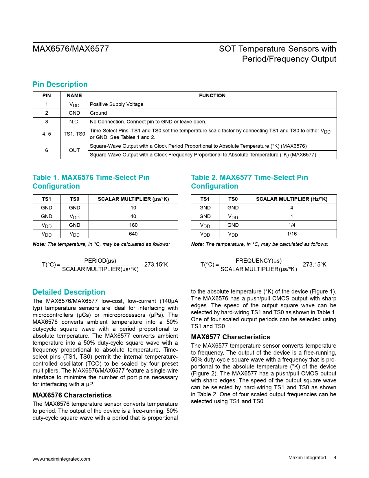 1 VDD Positive Supply Voltage 2 GND Ground 3 N.C. No Connection. Connect pin to GND or leave open. 4, 5 TS1, TS0 Time-Select Pins. TS1 and TS0 set the temperature scale factor by connecting TS1 and TS0 to either VDD or GND. See Tables 1 and 2. Square-Wave Output with a Clock Period Proportional to Absolute Temperature (°K) (MAX6576) 6 OUT Square-Wave Output with a Clock Frequency Proportional to Absolute Temperature (°K) (MAX6577)