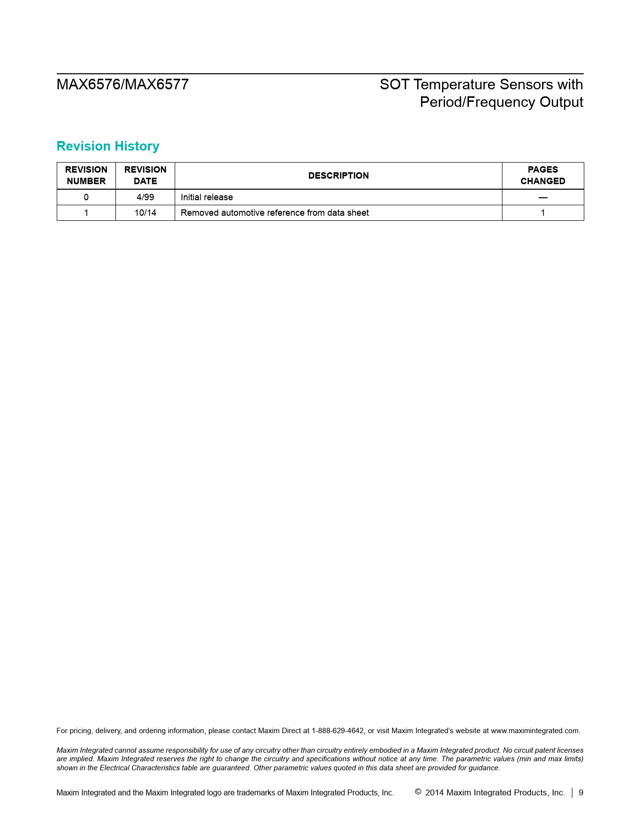 0 4/99 Initial release — 1 10/14 Removed automotive reference from data sheet 1 For pricing, delivery, and ordering information, please contact Maxim Direct at 1-888-629-4642, or visit Maxim Integrated’s website at www.maximintegrated.com. Maxim Integrated cannot assume responsibility for use of any circuitry other than circuitry entirely embodied in a Maxim Integrated product. No circuit patent licenses are implied. Maxim Integrated reserves the right to change the circuitry and specifications without notice at any time. The parametric values (min and max limits) shown in the Electrical Characteristics table are guaranteed. Other parametric values quoted in this data sheet are provided for guidance. Maxim Integrated and the Maxim Integrated logo are trademarks of Maxim Integrated Products, Inc. © 2014 Maxim Integrated Products, Inc. │ 9