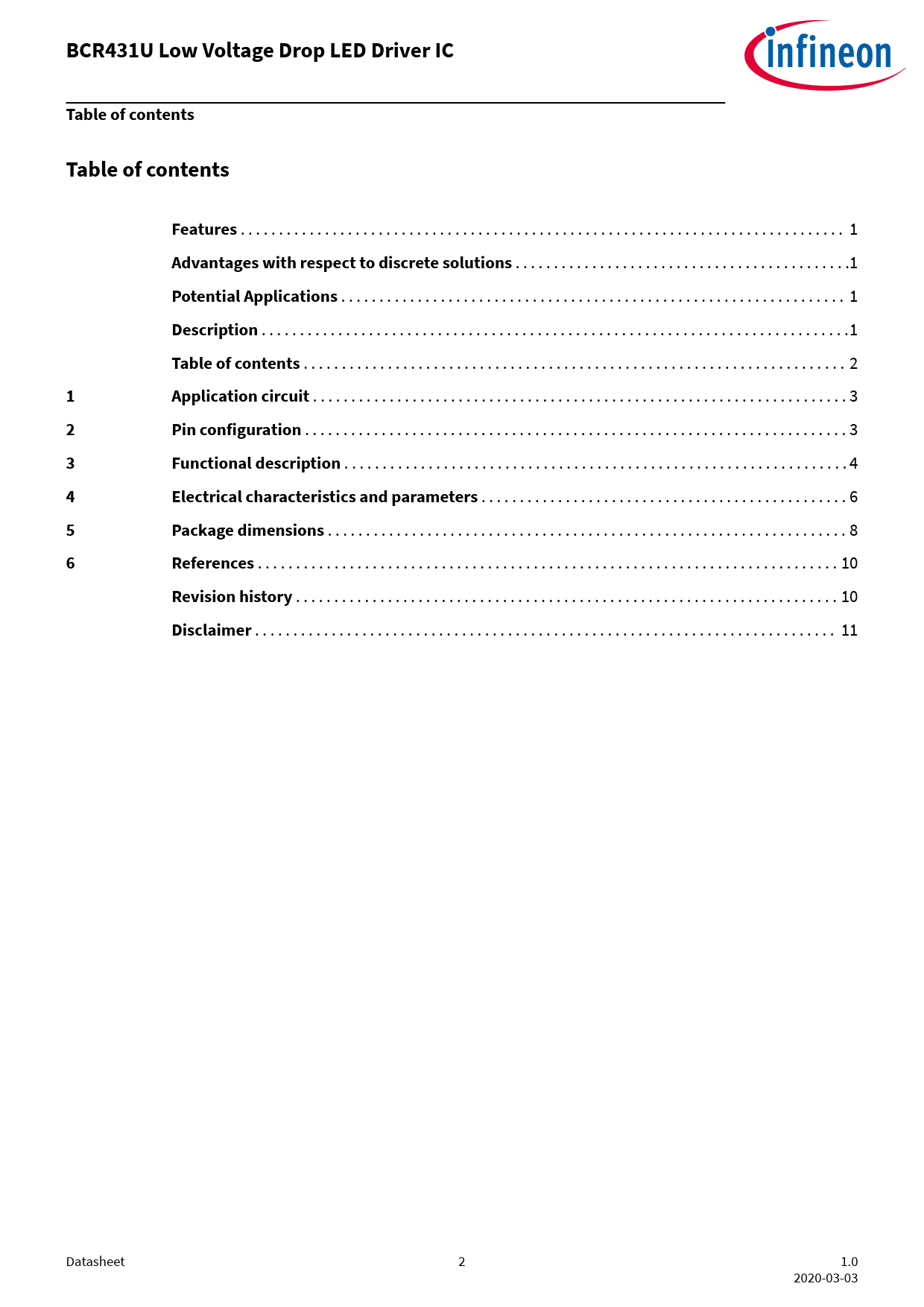 link to page 1 link to page 1 link to page 1 link to page 1 link to page 2 link to page 3 link to page 3 link to page 4 link to page 6 link to page 8 link to page 10 link to page 10 link to page 11 BCR431U Low Voltage Drop LED Driver ICTable of contentsTable of contentsFeatures . 1 Advantages with respect to discrete solutions . .1 Potential Applications . 1 Description . .1 Table of contents . 2 1Application circuit . 3 2Pin configuration . 3 3Functional description . 4 4Electrical characteristics and parameters . 6 5Package dimensions . 8 6References . 10 Revision history . 10 Disclaimer . 11 Datasheet 2 1.0 2020-03-03 Document Outline Features Advantages with respect to discrete solutions Potential Applications Description Table of contents 1 Application circuit 2 Pin configuration 3 Functional description 4 Electrical characteristics and parameters 5 Package dimensions 6 References Revision history Disclaimer