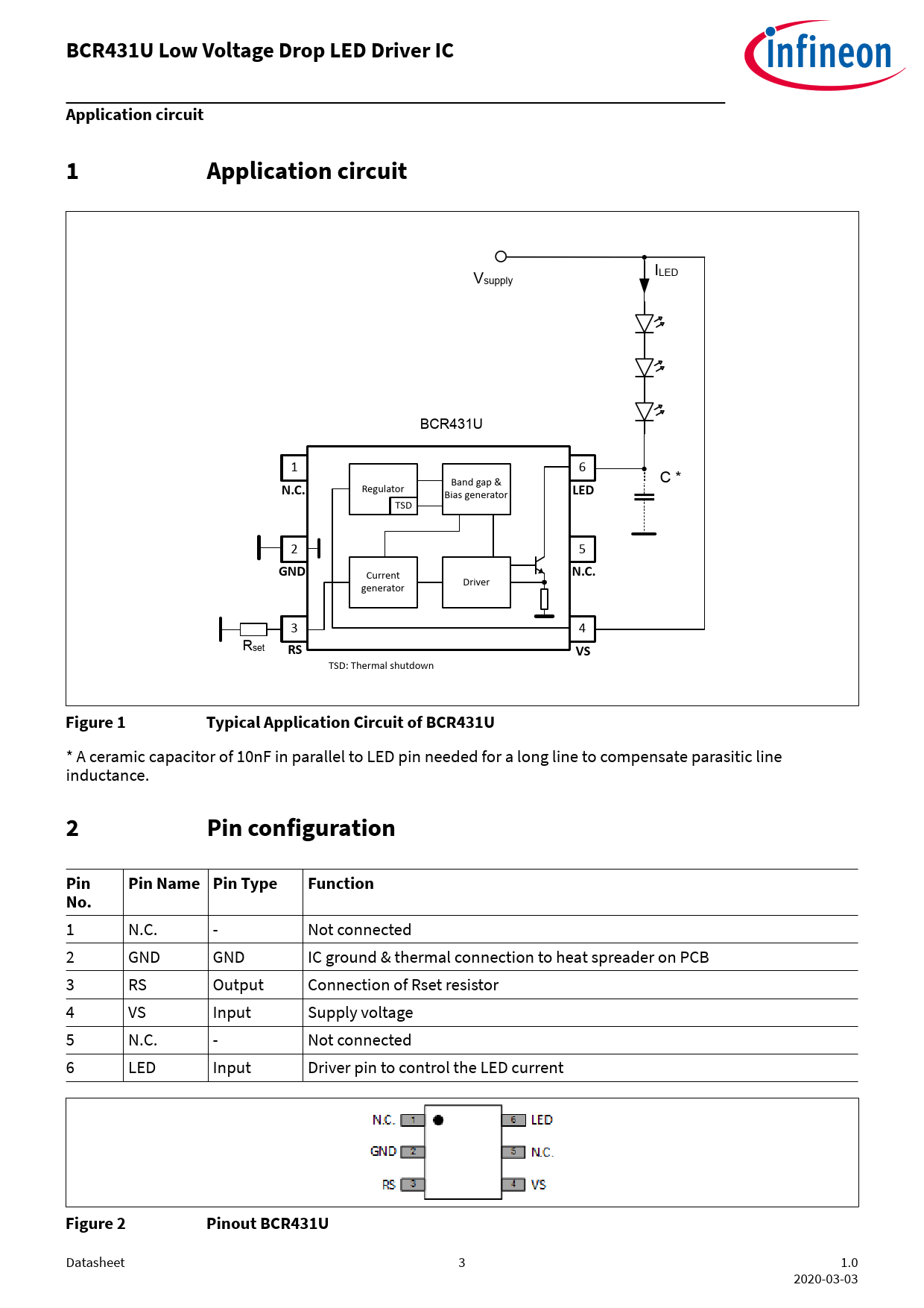 BCR431U Low Voltage Drop LED Driver IC Application circuit N.C LED GND Figure 1 Typical Application Circuit of BCR431U
