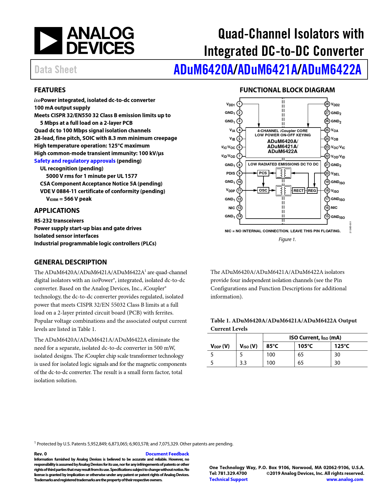 Quad-Channel Isolators with. Integrated DC-to-DC Converter. Data Sheet. ADuM6420A. /ADuM6421A. /ADuM6422A. FEATURES