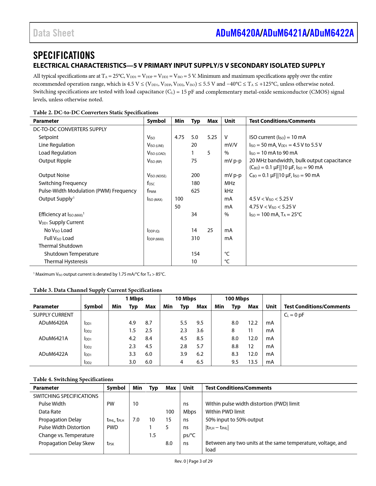 Pages / Page29 / 3 — Data Sheet. ADuM6420A/. ADuM6421A/. ADuM6422A. SPECIFICATIONS