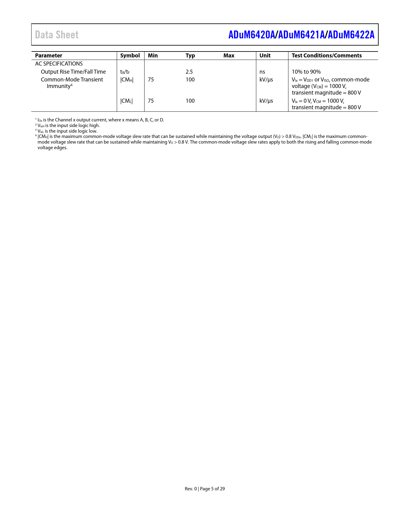 Data Sheet ADuM6420A/ ADuM6421A/ ADuM6422A Parameter Symbol Min Typ Max Unit Test Conditions/Comments
