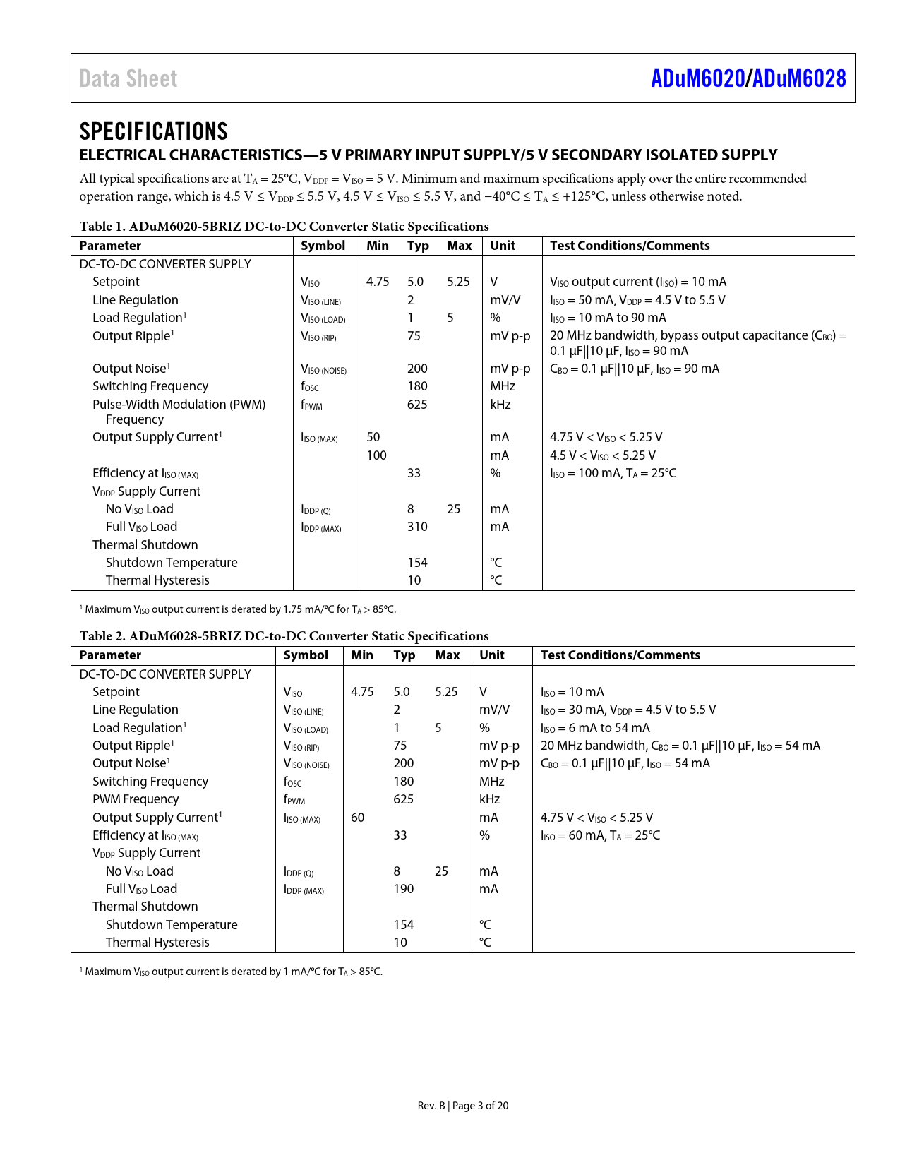 Data SheetADuM6020/ADuM6028SPECIFICATIONS ELECTRICAL CHARACTERISTICS—5 V PRIMARY INPUT SUPPLY/5 V SECONDARY ISOLATED SUPPLY All typical specifications are at TA = 25°C, VDDP = VISO = 5 V. Minimum and maximum specifications apply over the entire recommended operation range, which is 4.5 V ≤ VDDP ≤ 5.5 V, 4.5 V ≤ VISO ≤ 5.5 V, and −40°C ≤ TA ≤ +125°C, unless otherwise noted. Table 1. ADuM6020-5BRIZ DC-to-DC Converter Static Specifications Parameter SymbolMinTypMaxUnitTestConditions/Comments DC-TO-DC CONVERTER SUPPLY Setpoint VISO 4.75 5.0 5.25 V VISO output current (IISO) = 10 mA Line Regulation VISO (LINE) 2 mV/V IISO = 50 mA, VDDP = 4.5 V to 5.5 V Load Regulation1 VISO (LOAD) 1 5 % IISO = 10 mA to 90 mA Output Ripple1 VISO (RIP) 75 mV p-p 20 MHz bandwidth, bypass output capacitance (CBO) = 0.1 μF||10 μF, IISO = 90 mA Output Noise1 VISO (NOISE) 200 mV p-p CBO = 0.1 μF||10 μF, IISO = 90 mA Switching Frequency fOSC 180 MHz Pulse-Width Modulation (PWM) fPWM 625 kHz Frequency Output Supply Current1 IISO (MAX) 50 mA 4.75 V < VISO < 5.25 V 100 mA 4.5 V < VISO < 5.25 V Efficiency at IISO (MAX) 33 % IISO = 100 mA, TA = 25°C VDDP Supply Current No VISO Load IDDP (Q) 8 25 mA Full VISO Load IDDP (MAX) 310 mA Thermal Shutdown Shutdown Temperature 154 °C Thermal Hysteresis 10 °C 1 Maximum VISO output current is derated by 1.75 mA/ºC for TA > 85ºC. Table 2. ADuM6028-5BRIZ DC-to-DC Converter Static Specifications Parameter SymbolMinTypMaxUnitTestConditions/Comments DC-TO-DC CONVERTER SUPPLY Setpoint VISO 4.75 5.0 5.25 V IISO = 10 mA Line Regulation VISO (LINE) 2 mV/V IISO = 30 mA, VDDP = 4.5 V to 5.5 V Load Regulation1 VISO (LOAD) 1 5 % IISO = 6 mA to 54 mA Output Ripple1 VISO (RIP) 75 mV p-p 20 MHz bandwidth, CBO = 0.1 μF||10 μF, IISO = 54 mA Output Noise1 VISO (NOISE) 200 mV p-p CBO = 0.1 μF||10 μF, IISO = 54 mA Switching Frequency fOSC 180 MHz PWM Frequency fPWM 625 kHz Output Supply Current1 IISO (MAX) 60 mA 4.75 V < VISO < 5.25 V Efficiency at IISO (MAX) 33 % IISO = 60 mA, TA = 25°C VDDP Supply Current No VISO Load IDDP (Q) 8 25 mA Full VISO Load IDDP (MAX) 190 mA Thermal Shutdown Shutdown Temperature 154 °C Thermal Hysteresis 10 °C 1 Maximum VISO output current is derated by 1 mA/ºC for TA > 85ºC. Rev. B | Page 3 of 20 Document Outline Features Applications Functional Block Diagrams General Description Revision History Specifications Electrical Characteristics—5 V Primary Input Supply/5 V Secondary Isolated Supply Electrical Characteristics—5 V Primary Input Supply/3.3 V Secondary Isolated Supply Electrical Characteristics—3.3 V Primary Input Supply/3.3 V Secondary Isolated Supply Regulatory Approvals Insulation and Safety Related Specifications Package Characteristics DIN V VDE V 0884-10 (VDE V 0884-10) Insulation Characteristics Recommended Operating Conditions Absolute Maximum Ratings ESD Caution Pin Configuration and Function Descriptions Truth Table Typical Performance Characteristics Theory of Operation Applications Information PCB Layout Thermal Analysis EMI Considerations Insulation Lifetime Surface Tracking Insulation Wear Out Calculation and Use of Parameters Example Outline Dimensions Ordering Guide