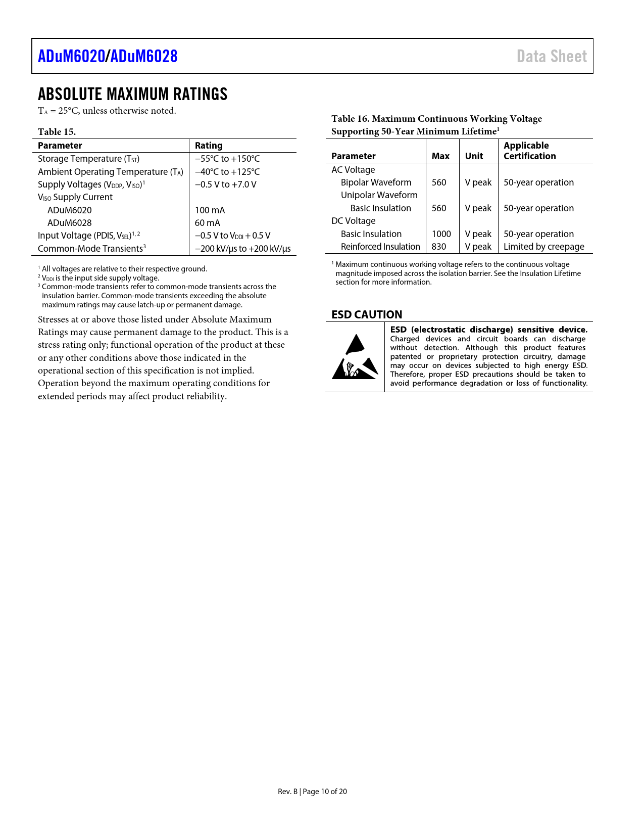 ADuM6020/. ADuM6028. Data Sheet. ABSOLUTE MAXIMUM RATINGS. Table 16. Maximum Continuous Working Voltage. Table 15