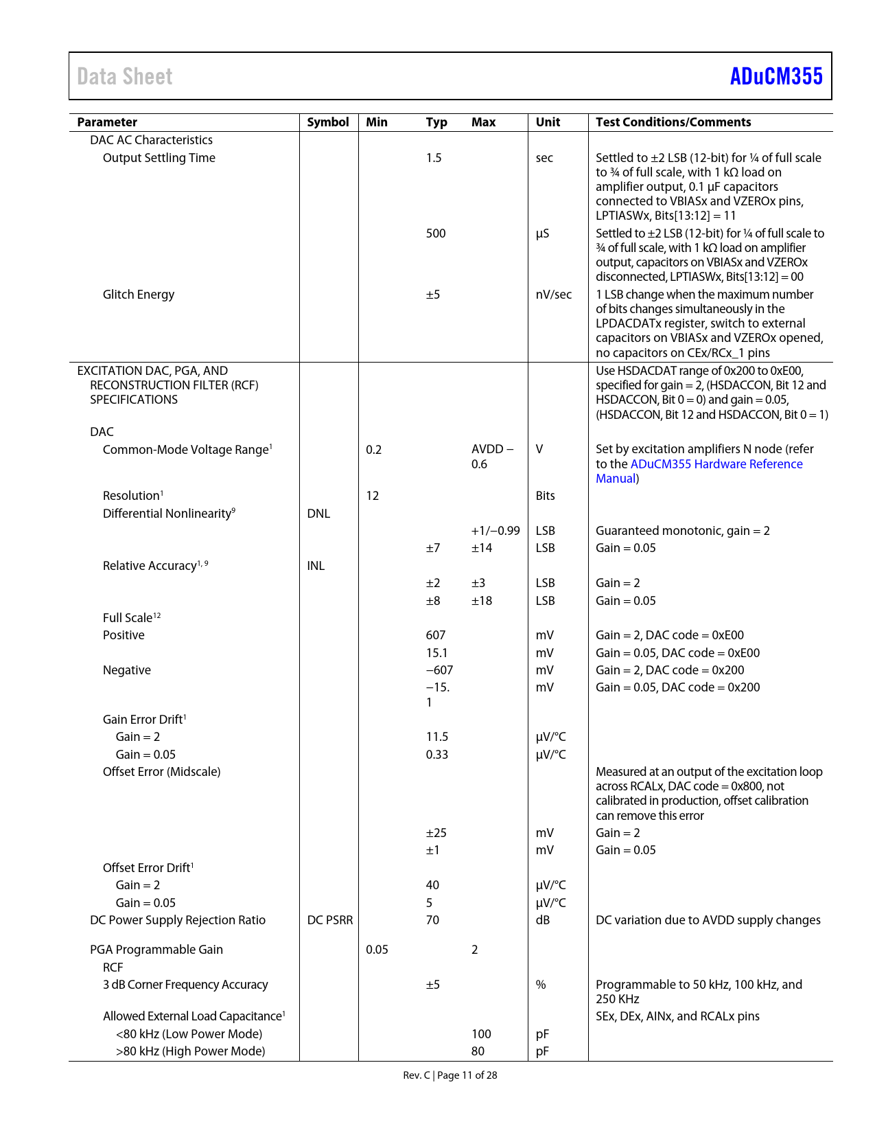 Pages / Page28 / 11 — Data Sheet. ADuCM355. Parameter Symbol. Min. Typ. Max. Unit. Test. …