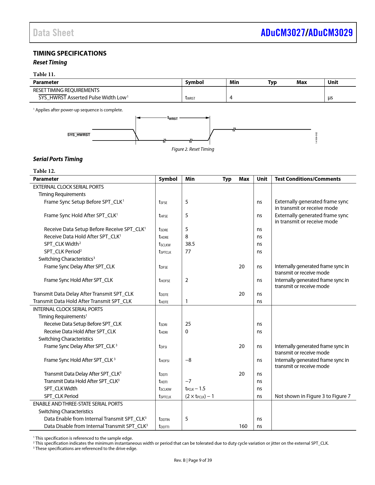 Data Sheet ADuCM3027/ ADuCM3029 TIMING SPECIFICATIONS Reset Timing Table 11 Parameter Symbol Min Typ Max Unit tWRST SYS_HWRST