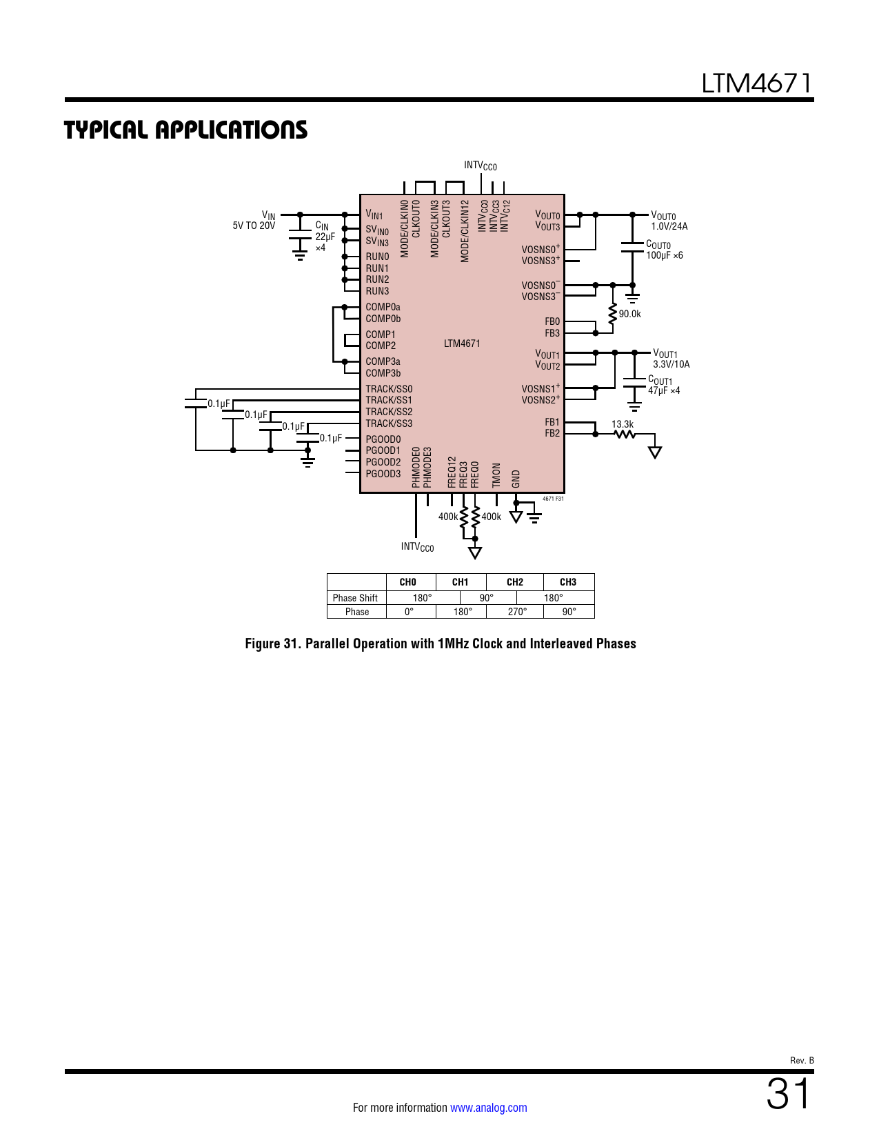 INTVCC0 V V IN IN1 V CC0 V CC3 V C12 VOUT0 VOUT0 5V TO 20V CIN SV V 1.0V/24A IN0 INT INT INT OUT3 22µF SV CLKOUT0 CLKOUT3 IN3 ×4 VOSNS0+ COUT0 RUN0 MODE/CLKIN0 MODE/CLKIN3 MODE/CLKIN12 VOSNS3+ 100µF ×6 RUN1 RUN2 RUN3 VOSNS0– VOSNS3– COMP0a 90.0k COMP0b FB0 COMP1 FB3 COMP2 LTM4671 V V OUT1 OUT1 COMP3a V 3.3V/10A COMP3b OUT2 COUT1 TRACK/SS0 VOSNS1+ 47µF ×4 TRACK/SS1 VOSNS2+ 0.1μF TRACK/SS2 0.1μF TRACK/SS3 FB1 0.1μF 13.3k 0.1μF PGOOD0 FB2 PGOOD1 PGOOD2 PGOOD3 PHMODE0 PHMODE3 FREQ12 FREQ3 FREQ0 TMON GND 4671 F31 400k 400k INTVCC0