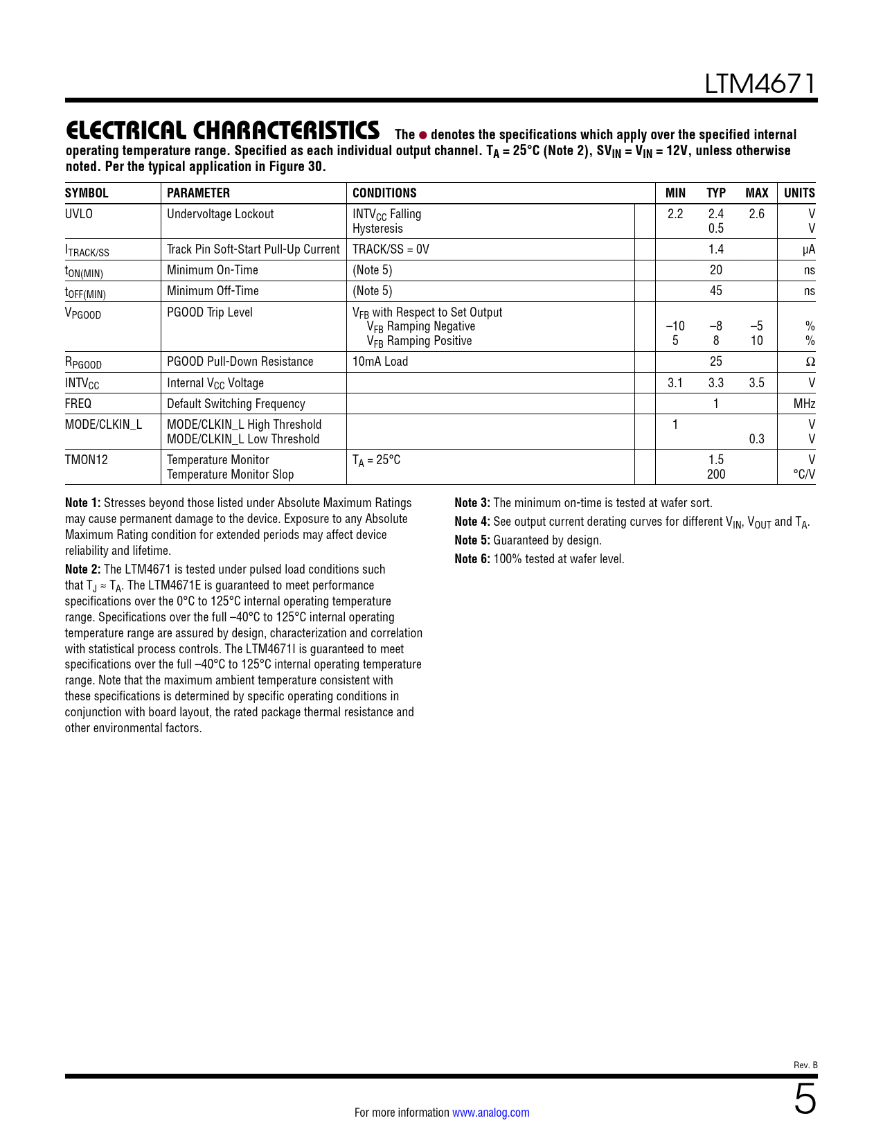 link to page 30 LTM4671 ELECTRICAL CHARACTERISTICSThe l denotes the specifications which apply over the specified internaloperating temperature range. Specified as each individual output channel. TA = 25°C (Note 2), SVIN = VIN = 12V, unless otherwisenoted. Per the typical application in Figure 30.SYMBOLPARAMETERCONDITIONSMINTYPMAX UNITS UVLO Undervoltage Lockout INTVCC Falling 2.2 2.4 2.6 V Hysteresis 0.5 V ITRACK/SS Track Pin Soft-Start Pull-Up Current TRACK/SS = 0V 1.4 µA tON(MIN) Minimum On-Time (Note 5) 20 ns tOFF(MIN) Minimum Off-Time (Note 5) 45 ns VPGOOD PGOOD Trip Level VFB with Respect to Set Output VFB Ramping Negative –10 –8 –5 % VFB Ramping Positive 5 8 10 % RPGOOD PGOOD Pull-Down Resistance 10mA Load 25 Ω INTVCC Internal VCC Voltage 3.1 3.3 3.5 V FREQ Default Switching Frequency 1 MHz MODE/CLKIN_L MODE/CLKIN_L High Threshold 1 V MODE/CLKIN_L Low Threshold 0.3 V TMON12 Temperature Monitor TA = 25°C 1.5 V Temperature Monitor Slop 200 °C/V Note 1: Stresses beyond those listed under Absolute Maximum Ratings Note 3: The minimum on-time is tested at wafer sort. may cause permanent damage to the device. Exposure to any Absolute Note 4: See output current derating curves for different VIN, VOUT and TA. Maximum Rating condition for extended periods may affect device Note 5: Guaranteed by design. reliability and lifetime. Note 6: 100% tested at wafer level. Note 2: The LTM4671 is tested under pulsed load conditions such that TJ ≈ TA. The LTM4671E is guaranteed to meet performance specifications over the 0°C to 125°C internal operating temperature range. Specifications over the full –40°C to 125°C internal operating temperature range are assured by design, characterization and correlation with statistical process controls. The LTM4671I is guaranteed to meet specifications over the full –40°C to 125°C internal operating temperature range. Note that the maximum ambient temperature consistent with these specifications is determined by specific operating conditions in conjunction with board layout, the rated package thermal resistance and other environmental factors. Rev. B For more information www.analog.com 5 Document Outline Features Applications Typical Application Description Absolute Maximum Ratings Pin Configuration Order Information Electrical Characteristics Typical Performance Characteristics Pin Functions Block Diagram Decoupling Requirements Operation Applications Information Typical Applications Component BGA Pinout Package Description Revision History Package Photo Related Parts