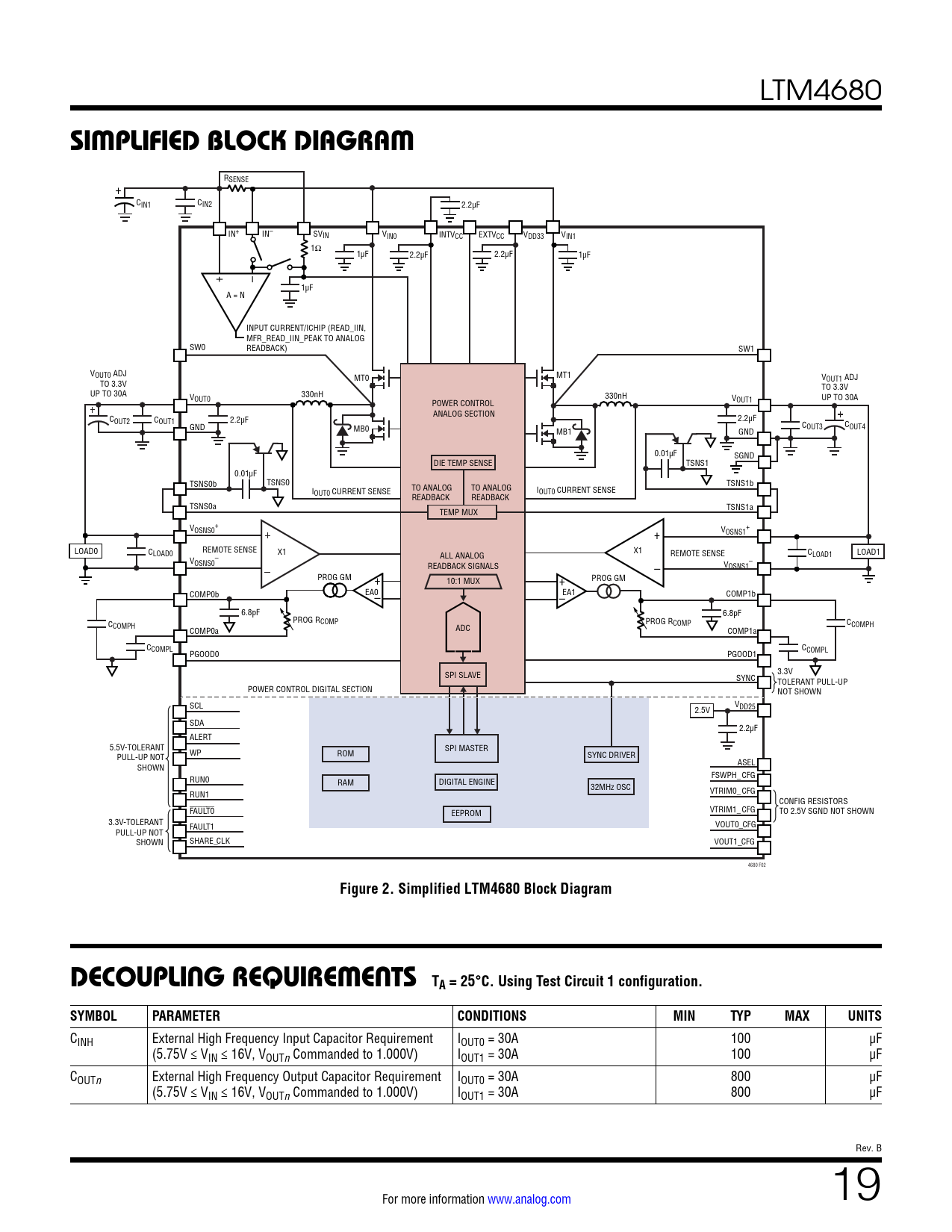 LTM4680 SIMPLIFIED BLOCK DIAGRAM RSENSE + C C IN1 IN2 2.2µF IN– IN+ SVIN VIN0 INTVCC EXTVCC VDD33 VIN1 1Ω 1µF 2.2µF 2.2µF 1µF + – 1µF A = N INPUT CURRENT/ICHIP (READ_IIN, MFR_READ_IIN_PEAK TO ANALOG SW0 READBACK) SW1 VOUT0 ADJ MT1 MT0 VOUT1 ADJ TO 3.3V TO 3.3V UP TO 30A 330nH V 330nH OUT0 VOUT1 UP TO 30A POWER CONTROL ANALOG SECTION COUT2 COUT1 2.2µF 2.2µF GND MB0 C MB1 OUT3 COUT4 GND 0.01µF SGND DIE TEMP SENSE TSNS1 0.01µF TSNS0b TSNS0 TSNS1b I TO ANALOG TO ANALOG OUT0 CURRENT SENSE IOUT0 CURRENT SENSE READBACK READBACK TSNS0a TSNS1a TEMP MUX V + OSNS0 V + OSNS1 + LOAD0 CLOAD0 REMOTE SENSE X1 X1 ALL ANALOG REMOTE SENSE CLOAD1 LOAD1 V – OSNS0 READBACK SIGNALS V – OSNS1 – PROG GM PROG GM + 10:1 MUX + COMP0b EA0 COMP1b – –EA1 6.8pF 6.8pF C PROG RCOMP PROG R COMPH COMP CCOMPH COMP0a ADC COMP1a CCOMPL CCOMPL PGOOD0 PGOOD1 SPI SLAVE 3.3V SYNC TOLERANT PULL-UP POWER CONTROL DIGITAL SECTION NOT SHOWN SCL VDD25 2.5V SDA 2.2µF ALERT 5.5V-TOLERANT SPI MASTER WP PULL-UP NOT ROM SYNC DRIVER ASEL SHOWN FSWPH_CFG RUN0 RAM DIGITAL ENGINE 32MHz OSC VTRIM0_CFG RUN1 CONFIG RESISTORS FAULT0 VTRIM1_CFG TO 2.5V SGND NOT SHOWN EEPROM 3.3V-TOLERANT VOUT0_CFG FAULT1 PULL-UP NOT SHOWN SHARE_CLK VOUT1_CFG 4680 F02 Figure 2. Simplified LTM4680 Block DiagramDECOUPLING REQUIREMENTS TA = 25°C. Using Test Circuit 1 configuration. SYMBOLPARAMETERCONDITIONSMINTYPMAXUNITS CINH External High Frequency Input Capacitor Requirement IOUT0 = 30A 100 µF (5.75V ≤ VIN ≤ 16V, VOUTn Commanded to 1.000V) IOUT1 = 30A 100 µF COUTn External High Frequency Output Capacitor Requirement IOUT0 = 30A 800 µF (5.75V ≤ VIN ≤ 16V, VOUTn Commanded to 1.000V) IOUT1 = 30A 800 µF Rev. B For more information www.analog.com 19 Document Outline Features Applications Typical Application Description Table of Contents Absolute Maximum Ratings Order Information Pin Configuration Electrical Characteristics Typical Performance Characteristics Pin Functions Simplified Block Diagram Decoupling Requirements Functional Diagram Test Circuits Operation Power Module Introduction Power Module Overview, Major Features EEPROM with ECC Power-Up and Initialization Soft-Start Time-Based Sequencing Voltage-Based Sequencing Shutdown Light-Load Current Operation Switching Frequency and Phase PWM Loop Compensation Output Voltage Sensing INTVCC/EXTVCC Power Output Current Sensing and Sub Milliohm DCR Current Sensing Input Current Sensing PolyPhase Load Sharing External/Internal Temperature Sense RCONFIG (Resistor Configuration) Pins Table 1. VOUTn_CFG Pin Strapping Look-Up Table for the LTM4680’s Output Voltage, Coarse Setting (Not Applicable if MFR_CONFIG_ALL[6] = 1b) Table 2. VTRIMn_CFG Pin Strapping Look-Up Table for the LTM4680’s Output Voltage, Fine Adjustment Setting (Not Applicable if MFR_CONFIG_ALL[6] = 1b) Table 3. FSWPH_CFG Pin Strapping Look-Up Table to Set the LTM4680’s Switching Frequency and Channel Phase-Interleaving Angle (Not Applicable if MFR_CONFIG_ALL[6] = 1b) Table 4. ASEL Pin Strapping Look-Up Table to Set the LTM4680’s Slave Address (Applicable Regardless of MFR_CONFIG_ALL[6] Setting) Table 5. LTM4680 MFR_ADDRESS Command Examples Expressed in 7- and 8-Bit Addressing Fault Detection and Handling Status Registers and ALERT Masking Figure 5. LTM4680 Status Register Summary Mapping Faults to FAULT Pins Power Good Pins CRC Protection Serial Interface Communication Protection Device Addressing Responses to VOUT and IIN/IOUT Faults Output Overvoltage Fault Response Output Undervoltage Response Peak Output Overcurrent Fault Response Responses to Timing Faults Responses to VIN OV Faults Responses to OT/UT Faults Internal Overtemperature Fault Response External Overtemperature and Undertemperature Fault Response Responses to Input Overcurrent and Output Undercurrent Faults Responses to External Faults Fault Logging Bus Timeout Protection Similarity Between PMBus, SMBus and I2C 2-Wire Interface PMBus Serial Digital Interface Table 6. Abbreviations of Supported Data Formats Figure 6. PMBus Timing Diagram Figures 7 to 24 PMBus Protocols PMBus Command Summary PMBus Commands Table 7. PMBus Commands Summary (Note: The Data Format Abbreviations Are Detailed in Table 8) Table 8. Data Format Abbreviations Applications Information VIN to VOUT Step-Down Ratios Input Capacitors Output Capacitors Light Load Current Operation Switching Frequency and Phase Output Current Limit Programming Minimum On-Time Considerations Variable Delay Time, Soft-Start and Output Voltage Ramping Digital Servo Mode Soft Off (Sequenced Off) Undervoltage Lockout Fault Detection and Handling Open-Drain Pins Phase-Locked Loop and Frequency Synchronization Input Current Sense Amplifier Programmable Loop Compensation Checking Transient Response PolyPhase Configuration Connecting The USB to I2C/SMBus/PMBus Controller to the LTM4680 In System LTpowerPlay: An Interactive GUI for Digital Power PMBus Communication and Command Processing Thermal Considerations and Output Current Derating Tables 10 thru 11: Output Current Derating Table 12. Channel Output Voltage vs Capacitor Selection, All Ceramic Configuration, 15A to 30A Load Step with 15A/µs Slew Rate Table 13. Channel Output Voltage vs Capacitor Selection, Bulk and Ceramic Cap Configuration, 15A to 30A Load Step with 15A/µs Slew Rate Table 14. Dual Phase Single Output Voltage vs Capacitor Selection, Bulk and Ceramic Cap Configuration, 30A to 60A Load Step with 30A/µs Slew Rate Derating Curves EMI Performance Safety Considerations Layout Checklist/Example Typical Applications PMBus Command Details Addressing and Write Protect General Configuration Commands On/Off/Margin PWM Configuration Voltage Input Voltage and Limits Output Voltage and Limits Output Current and Limits Input Current and Limits Temperature Power Stage DCR Temperature Calibration Timing Timing—On Sequence/Ramp Timing—Off Sequence/Ramp Precondition for Restart Fault Response Fault Responses All Faults Fault Responses Input Voltage Fault