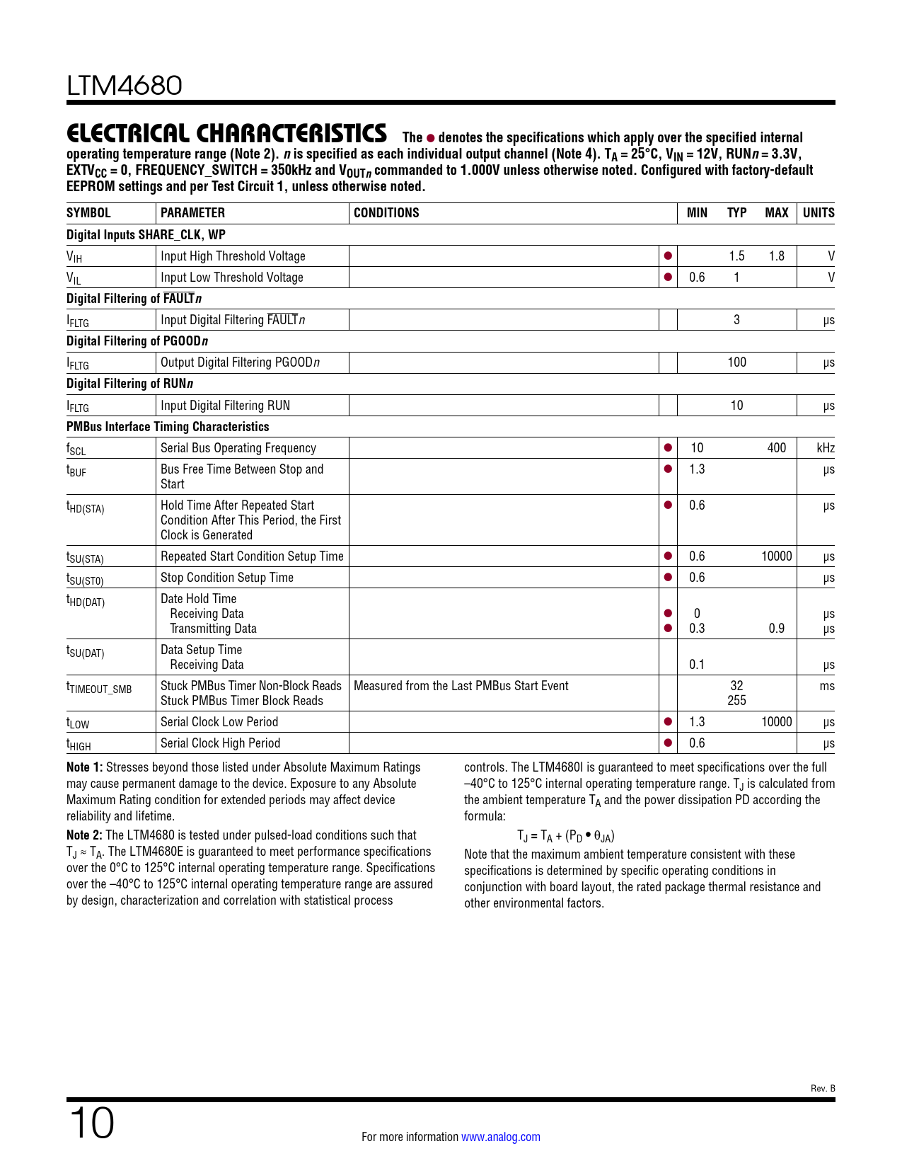 θJA) TJ ≈ TA. The LTM4680E is guaranteed to meet performance specifications Note that the maximum ambient temperature consistent with these over the 0°C to 125°C internal operating temperature range. Specifications specifications is determined by specific operating conditions in over the –40°C to 125°C internal operating temperature range are assured conjunction with board layout, the rated package thermal resistance and by design, characterization and correlation with statistical process other environmental factors. Rev. B 10 For more information www.analog.com Document Outline Features Applications Typical Application Description Table of Contents Absolute Maximum Ratings Order Information Pin Configuration Electrical Characteristics Typical Performance Characteristics Pin Functions Simplified Block Diagram Decoupling Requirements Functional Diagram Test Circuits Operation Power Module Introduction Power Module Overview, Major Features EEPROM with ECC Power-Up and Initialization Soft-Start Time-Based Sequencing Voltage-Based Sequencing Shutdown Light-Load Current Operation Switching Frequency and Phase PWM Loop Compensation Output Voltage Sensing INTVCC/EXTVCC Power Output Current Sensing and Sub Milliohm DCR Current Sensing Input Current Sensing PolyPhase Load Sharing External/Internal Temperature Sense RCONFIG (Resistor Configuration) Pins Table 1. VOUTn_CFG Pin Strapping Look-Up Table for the LTM4680’s Output Voltage, Coarse Setting (Not Applicable if MFR_CONFIG_ALL[6] = 1b) Table 2. VTRIMn_CFG Pin Strapping Look-Up Table for the LTM4680’s Output Voltage, Fine Adjustment Setting (Not Applicable if MFR_CONFIG_ALL[6] = 1b) Table 3. FSWPH_CFG Pin Strapping Look-Up Table to Set the LTM4680’s Switching Frequency and Channel Phase-Interleaving Angle (Not Applicable if MFR_CONFIG_ALL[6] = 1b) Table 4. ASEL Pin Strapping Look-Up Table to Set the LTM4680’s Slave Address (Applicable Regardless of MFR_CONFIG_ALL[6] Setting) Table 5. LTM4680 MFR_ADDRESS Command Examples Expressed in 7- and 8-Bit Addressing Fault Detection and Handling Status Registers and ALERT Masking Figure 5. LTM4680 Status Register Summary Mapping Faults to FAULT Pins Power Good Pins CRC Protection Serial Interface Communication Protection Device Addressing Responses to VOUT and IIN/IOUT Faults Output Overvoltage Fault Response Output Undervoltage Response Peak Output Overcurrent Fault Response Responses to Timing Faults Responses to VIN OV Faults Responses to OT/UT Faults Internal Overtemperature Fault Response External Overtemperature and Undertemperature Fault Response Responses to Input Overcurrent and Output Undercurrent Faults Responses to External Faults Fault Logging Bus Timeout Protection Similarity Between PMBus, SMBus and I2C 2-Wire Interface PMBus Serial Digital Interface Table 6. Abbreviations of Supported Data Formats Figure 6. PMBus Timing Diagram Figures 7 to 24 PMBus Protocols PMBus Command Summary PMBus Commands Table 7. PMBus Commands Summary (Note: The Data Format Abbreviations Are Detailed in Table 8) Table 8. Data Format Abbreviations Applications Information VIN to VOUT Step-Down Ratios Input Capacitors Output Capacitors Light Load Current Operation Switching Frequency and Phase Output Current Limit Programming Minimum On-Time Considerations Variable Delay Time, Soft-Start and Output Voltage Ramping Digital Servo Mode Soft Off (Sequenced Off) Undervoltage Lockout Fault Detection and Handling Open-Drain Pins Phase-Locked Loop and Frequency Synchronization Input Current Sense Amplifier Programmable Loop Compensation Checking Transient Response PolyPhase Configuration Connecting The USB to I2C/SMBus/PMBus Controller to the LTM4680 In System LTpowerPlay: An Interactive GUI for Digital Power PMBus Communication and Command Processing Thermal Considerations and Output Current Derating Tables 10 thru 11: Output Current Derating Table 12. Channel Output Voltage vs Capacitor Selection, All Ceramic Configuration, 15A to 30A Load Step with 15A/µs Slew Rate Table 13. Channel Output Voltage vs Capacitor Selection, Bulk and Ceramic Cap Configuration, 15A to 30A Load Step with 15A/µs Slew Rate Table 14. Dual Phase Single Output Voltage vs Capacitor Selection, Bulk and Ceramic Cap Configuration, 30A to 60A Load Step with 30A/µs Slew Rate Derating Curves EMI Performance Safety Considerations Layout Checklist/Example Typical Applications PMBus Command Details Addressing and Write Protect General Configuration Commands On/Off/Margin PWM Configuration Voltage Input Voltage and Limits Output Voltage and Limits Output Current and Limits Input Current and Limits Temperature Power Stage DCR Temperature Calibration Timing Timing—On Sequence/Ramp Timing—Off Sequence/Ramp Precondition for Restart Fault Response Fault Responses All Faults Fault Responses Input Voltage Fault Responses Output Voltage Fault Responses Output Current Fault Responses IC Temperature Fault Responses External Temperature Fault Sharing Fault Sharing Propagation Fault Sharing Response Scratchpad Identification Fault Warning and Status Telemetry NVM Memory Commands Store/Restore Fault Logging Block Memory Write/Read Package Description Table 23. LTM4680 BGA Pinout Revision History Package Photograph Design Resources Related Parts