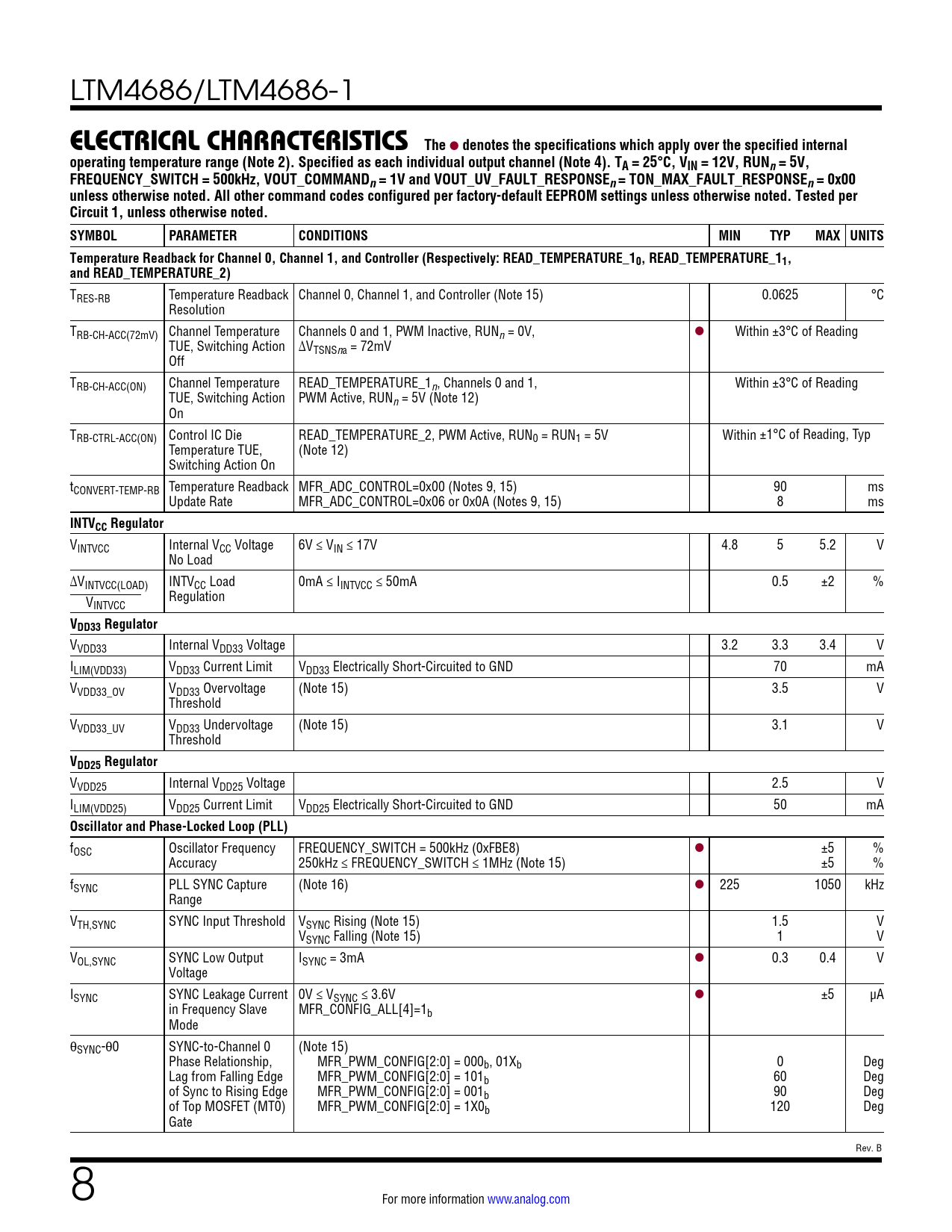 LTM4686/LTM4686-1 ELECTRICALCHARACTERISTICS The l denotes the specifications which apply over the specified internaloperating temperature range (Note 2). Specified as each individual output channel (Note 4). TA = 25°C, VIN = 12V, RUNn= 5V,FREQUENCY_SWITCH = 500kHz, VOUT_COMMANDn= 1V and VOUT_UV_FAULT_RESPONSEn= TON_MAX_FAULT_RESPONSEn= 0x00unless otherwise noted. All other command codes configured per factory-default EEPROM settings unless otherwise noted. Tested perCircuit 1, unless otherwise noted. SYMBOLPARAMETERCONDITIONSMINTYPMAX UNITSTemperature Readback for Channel 0, Channel 1, and Controller (Respectively: READ_TEMPERATURE_10, READ_TEMPERATURE_11,and READ_TEMPERATURE_2) TRES-RB Temperature Readback Channel 0, Channel 1, and Controller (Note 15) 0.0625 °C Resolution TRB-CH-ACC(72mV) Channel Temperature Channels 0 and 1, PWM Inactive, RUNn = 0V, l Within ±3°C of Reading TUE, Switching Action ∆VTSNSna = 72mV Off TRB-CH-ACC(ON) Channel Temperature READ_TEMPERATURE_1n, Channels 0 and 1, Within ±3°C of Reading TUE, Switching Action PWM Active, RUNn = 5V (Note 12) On TRB-CTRL-ACC(ON) Control IC Die READ_TEMPERATURE_2, PWM Active, RUN0 = RUN1 = 5V Within ±1°C of Reading, Typ Temperature TUE, (Note 12) Switching Action On tCONVERT-TEMP-RB Temperature Readback MFR_ADC_CONTROL=0x00 (Notes 9, 15) 90 ms Update Rate MFR_ADC_CONTROL=0x06 or 0x0A (Notes 9, 15) 8 ms INTVCC Regulator VINTVCC Internal VCC Voltage 6V ≤ VIN ≤ 17V 4.8 5 5.2 V No Load ∆VINTVCC(LOAD) INTVCC Load 0mA ≤ IINTVCC ≤ 50mA 0.5 ±2 % Regulation VINTVCC VDD33 Regulator VVDD33 Internal VDD33 Voltage 3.2 3.3 3.4 V ILIM(VDD33) VDD33 Current Limit VDD33 Electrically Short-Circuited to GND 70 mA VVDD33_OV VDD33 Overvoltage (Note 15) 3.5 V Threshold VVDD33_UV VDD33 Undervoltage (Note 15) 3.1 V Threshold VDD25 Regulator VVDD25 Internal VDD25 Voltage 2.5 V ILIM(VDD25) VDD25 Current Limit VDD25 Electrically Short-Circuited to GND 50 mA Oscillator and Phase-Locked Loop (PLL) fOSC Oscillator Frequency FREQUENCY_SWITCH = 500kHz (0xFBE8) l ±5 % Accuracy 250kHz ≤ FREQUENCY_SWITCH ≤ 1MHz (Note 15) ±5 % fSYNC PLL SYNC Capture (Note 16) l 225 1050 kHz Range VTH,SYNC SYNC Input Threshold VSYNC Rising (Note 15) 1.5 V VSYNC Falling (Note 15) 1 V VOL,SYNC SYNC Low Output ISYNC = 3mA l 0.3 0.4 V Voltage ISYNC SYNC Leakage Current 0V ≤ VSYNC ≤ 3.6V l ±5 µA in Frequency Slave MFR_CONFIG_ALL[4]=1b Mode θSYNC-θ0 SYNC-to-Channel 0 (Note 15) Phase Relationship, MFR_PWM_CONFIG[2:0] = 000b, 01Xb 0 Deg Lag from Falling Edge MFR_PWM_CONFIG[2:0] = 101b 60 Deg of Sync to Rising Edge MFR_PWM_CONFIG[2:0] = 001b 90 Deg of Top MOSFET (MT0) MFR_PWM_CONFIG[2:0] = 1X0b 120 Deg Gate Rev. B 8 For more information www.analog.com Document Outline Features Applications Typical Application Description Absolute Maximum Ratings Order Information Pin Configuration Electrical Characteristics Typical Performance Characteristics Pin Functions Simplified Block Diagram Decoupling Requirements Functional Diagram Test Circuits Operation Power Module Introduction Power Module Configurability and Readback Data Time-Averaged and Peak Readback Data Power Module Overview EEPROM Serial Interface Device Addressing Fault Detection and Handling Responses to VOUT and IOUT Faults Responses to Timing Faults Responses to SVIN OV Faults Responses to OT/UT Faults Responses to External Faults Fault Logging Bus Timeout Protection PMBus Command Summary PMBus Commands Applications Information VIN to VOUT Step-Down Ratios Input Capacitors Output Capacitors Light Load Current Operation Switching Frequency and Phase Minimum On-Time Considerations Variable Delay Time, Soft-Start and Output Voltage Ramping Digital Servo Mode Soft Off (Sequenced Off) Undervoltage Lockout Fault Detection and Handling Open-Drain Pins Phase-Locked Loop and Frequency Synchronization RCONFIG Pin-Straps (External Resistor Configuration Pins) Voltage Selection Connecting the USB to the I2C/SMBus/PMBus Controller to the LTM4686 In System LTpowerPlay: An Interactive GUI for Digital Power System Management PMBus Communication and Command Processing Thermal Considerations and Output Current Derating EMI Performance Safety Considerations Layout Checklist/Example Typical Applications Appendix A Similarity Between PMBus, SMBus and I2C 2-Wire Interface Appendix B PMBus Serial Digital Interface Appendix C: PMBus Command Details Addressing and Write Protect General Configuration Registers On/Off/Margin PWM Config Voltage Current Temperature Timing Fault Response Fault Sharing Scratchpad Identification Fault Warning and Status Telemetry NVM (EEPROM) Memory Commands Package Description Package Photographs Package Description Revision History Typical Application Design Resources Related Parts