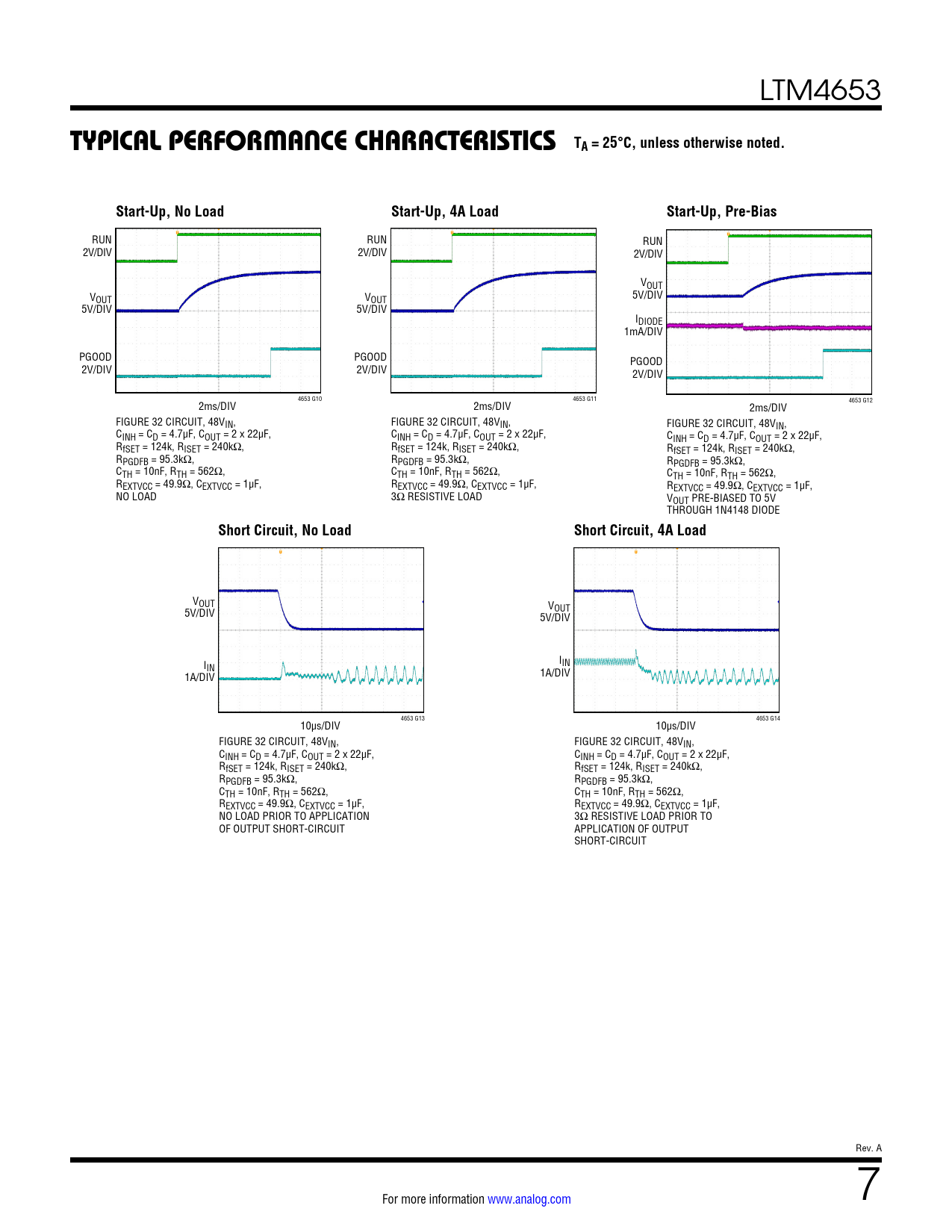 RUN RUN RUN 2V/DIV 2V/DIV 2V/DIV VOUT VOUT VOUT 5V/DIV 5V/DIV 5V/DIV IDIODE 1mA/DIV PGOOD PGOOD PGOOD 2V/DIV 2V/DIV 2V/DIV 4653 G10 4653 G11 2ms/DIV 2ms/DIV 4653 G12 2ms/DIV FIGURE 32 CIRCUIT, 48VIN, FIGURE 32 CIRCUIT, 48VIN, FIGURE 32 CIRCUIT, 48VIN, CINH = CD = 4.7µF, COUT = 2 x 22µF, CINH = CD = 4.7µF, COUT = 2 x 22µF, CINH = CD = 4.7µF, COUT = 2 x 22µF, RfSET = 124k, RISET = 240kΩ, RfSET = 124k, RISET = 240kΩ, RfSET = 124k, RISET = 240kΩ, RPGDFB = 95.3kΩ, RPGDFB = 95.3kΩ, RPGDFB = 95.3kΩ, CTH = 10nF, RTH = 562Ω, CTH = 10nF, RTH = 562Ω, CTH = 10nF, RTH = 562Ω, REXTVCC = 49.9Ω, CEXTVCC = 1µF, REXTVCC = 49.9Ω, CEXTVCC = 1µF, REXTVCC = 49.9Ω, CEXTVCC = 1µF, NO LOAD 3Ω RESISTIVE LOAD VOUT PRE-BIASED TO 5V THROUGH 1N4148 DIODE