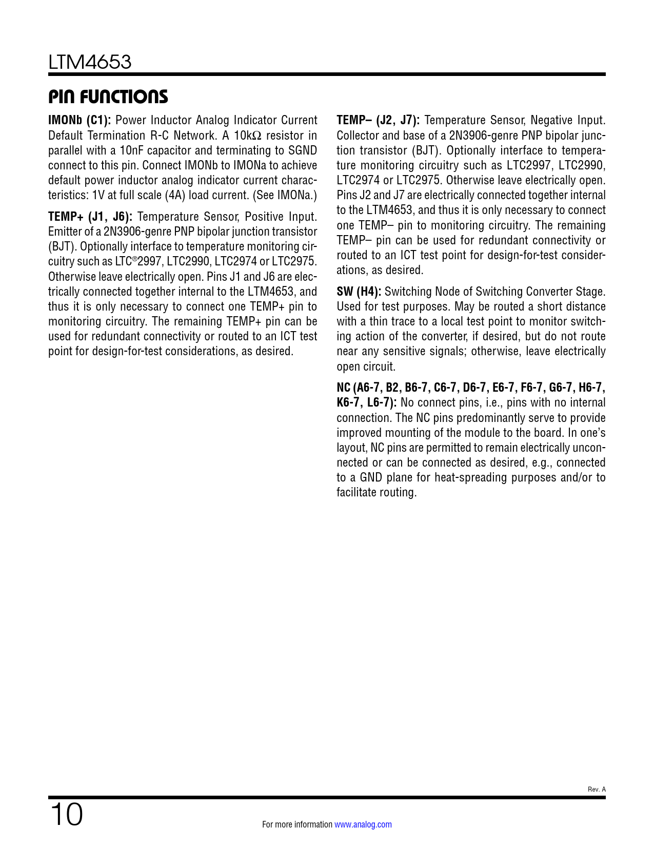 Pages / Page34 / 10 — PIN FUNCTIONS IMONb (C1):. TEMP– (J2, J7):. TEMP+ (J1, J6):. SW (H4):. NC …