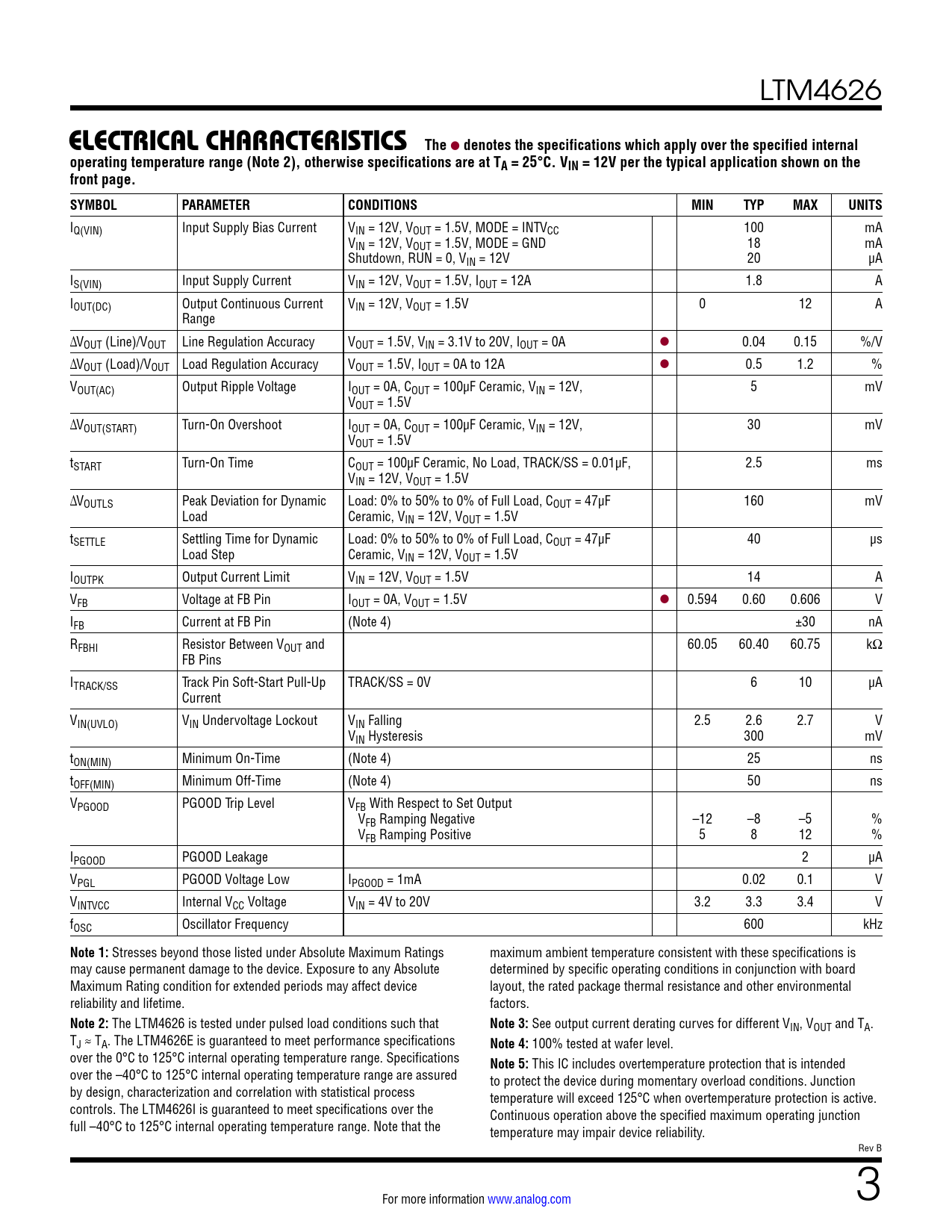 IQ(VIN) Input Supply Bias Current VIN = 12V, VOUT = 1.5V, MODE = INTVCC 100 mA VIN = 12V, VOUT = 1.5V, MODE = GND 18 mA Shutdown, RUN = 0, VIN = 12V 20 µA IS(VIN) Input Supply Current VIN = 12V, VOUT = 1.5V, IOUT = 12A 1.8 A IOUT(DC) Output Continuous Current VIN = 12V, VOUT = 1.5V 0 12 A Range ΔVOUT (Line)/VOUT Line Regulation Accuracy VOUT = 1.5V, VIN = 3.1V to 20V, IOUT = 0A l 0.04 0.15 %/V ΔVOUT (Load)/VOUT Load Regulation Accuracy VOUT = 1.5V, IOUT = 0A to 12A l 0.5 1.2 % VOUT(AC) Output Ripple Voltage IOUT = 0A, COUT = 100µF Ceramic, VIN = 12V, 5 mV VOUT = 1.5V ΔVOUT(START) Turn-On Overshoot IOUT = 0A, COUT = 100µF Ceramic, VIN = 12V, 30 mV VOUT = 1.5V tSTART Turn-On Time COUT = 100µF Ceramic, No Load, TRACK/SS = 0.01µF, 2.5 ms VIN = 12V, VOUT = 1.5V ΔVOUTLS Peak Deviation for Dynamic Load: 0% to 50% to 0% of Full Load, COUT = 47µF 160 mV Load Ceramic, VIN = 12V, VOUT = 1.5V tSETTLE Settling Time for Dynamic Load: 0% to 50% to 0% of Full Load, COUT = 47µF 40 µs Load Step Ceramic, VIN = 12V, VOUT = 1.5V IOUTPK Output Current Limit VIN = 12V, VOUT = 1.5V 14 A VFB Voltage at FB Pin IOUT = 0A, VOUT = 1.5V l 0.594 0.60 0.606 V IFB Current at FB Pin (Note 4) ±30 nA RFBHI Resistor Between VOUT and 60.05 60.40 60.75 kΩ FB Pins ITRACK/SS Track Pin Soft-Start Pull-Up TRACK/SS = 0V 6 10 µA Current VIN(UVLO) VIN Undervoltage Lockout VIN Falling 2.5 2.6 2.7 V VIN Hysteresis 300 mV tON(MIN) Minimum On-Time (Note 4) 25 ns tOFF(MIN) Minimum Off-Time (Note 4) 50 ns VPGOOD PGOOD Trip Level VFB With Respect to Set Output VFB Ramping Negative –12 –8 –5 % VFB Ramping Positive 5 8 12 % IPGOOD PGOOD Leakage 2 µA VPGL PGOOD Voltage Low IPGOOD = 1mA 0.02 0.1 V VINTVCC Internal VCC Voltage VIN = 4V to 20V 3.2 3.3 3.4 V fOSC Oscillator Frequency 600 kHz
