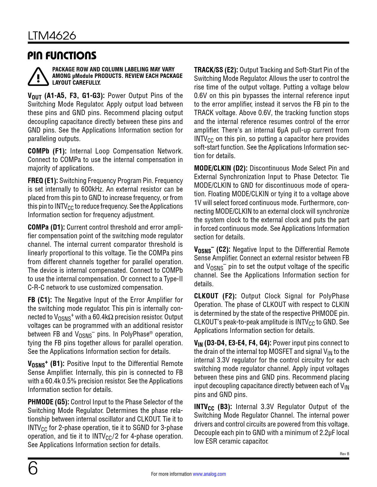 link to page 9 link to page 9 link to page 9 link to page 9 link to page 9 link to page 9 link to page 9 link to page 9 link to page 9 link to page 9 link to page 9 LTM4626 PIN FUNCTIONSPACKAGE ROW AND COLUMN LABELING MAY VARYTRACK/SS (E2): Output Tracking and Soft-Start Pin of the AMONG µModule PRODUCTS. REVIEW EACH PACKAGE Switching Mode Regulator. Allows the user to control the LAYOUT CAREFULLY. rise time of the output voltage. Putting a voltage below VOUT (A1-A5, F3, G1-G3): Power Output Pins of the 0.6V on this pin bypasses the internal reference input Switching Mode Regulator. Apply output load between to the error amplifier, instead it servos the FB pin to the these pins and GND pins. Recommend placing output TRACK voltage. Above 0.6V, the tracking function stops decoupling capacitance directly between these pins and and the internal reference resumes control of the error GND pins. See the Applications Information section for amplifier. There’s an internal 6µA pull-up current from paralleling outputs. INTVCC on this pin, so putting a capacitor here provides COMPb (F1): Internal Loop Compensation Network. soft-start function. See the Applications Information sec- Connect to COMPa to use the internal compensation in tion for details. majority of applications. MODE/CLKIN (D2): Discontinuous Mode Select Pin and FREQ (E1): Switching Frequency Program Pin. Frequency External Synchronization Input to Phase Detector. Tie is set internally to 600kHz. An external resistor can be MODE/CLKIN to GND for discontinuous mode of opera- placed from this pin to GND to increase frequency, or from tion. Floating MODE/CLKIN or tying it to a voltage above this pin to INTV 1V will select forced continuous mode. Furthermore, con- CC to reduce frequency. See the Applications Information section for frequency adjustment. necting MODE/CLKIN to an external clock will synchronize the system clock to the external clock and puts the part COMPa (D1): Current control threshold and error ampli- in forced continuous mode. See Applications Information fier compensation point of the switching mode regulator section for details. channel. The internal current comparator threshold is – linearly proportional to this voltage. Tie the COMPa pins VOSNS (C2): Negative Input to the Differential Remote from different channels together for parallel operation. Sense Amplifier. Connect an external resistor between FB – The device is internal compensated. Connect to COMPb and VOSNS pin to set the output voltage of the specific to use the internal compensation. Or connect to a Type-II channel. See the Applications Information section for C-R-C network to use customized compensation. details. FB (C1): The Negative Input of the Error Amplifier for CLKOUT (F2): Output Clock Signal for PolyPhase the switching mode regulator. This pin is internally con- Operation. The phase of CLKOUT with respect to CLKIN nected to V + is determined by the state of the respective PHMODE pin. OSNS with a 60.4kΩ precision resistor. Output voltages can be programmed with an additional resistor CLKOUT’s peak-to-peak amplitude is INTVCC to GND. See between FB and V – Applications Information section for details. OSNS pins. In PolyPhase® operation, tying the FB pins together allows for parallel operation. VIN (D3-D4, E3-E4, F4, G4): Power input pins connect to See the Applications Information section for details. the drain of the internal top MOSFET and signal VIN to the V+ internal 3.3V regulator for the control circuitry for each OSNS (B1): Positive Input to the Differential Remote Sense Amplifier. Internally, this pin is connected to FB switching mode regulator channel. Apply input voltages with a 60.4k 0.5% precision resistor. See the Applications between these pins and GND pins. Recommend placing Information section for details. input decoupling capacitance directly between each of VIN pins and GND pins. PHMODE (G5): Control Input to the Phase Selector of the Switching Mode Regulator. Determines the phase rela- INTVCC (B3): Internal 3.3V Regulator Output of the tionship between internal oscillator and CLKOUT. Tie it to Switching Mode Regulator Channel. The internal power INTV drivers and control circuits are powered from this voltage. CC for 2-phase operation, tie it to SGND for 3-phase operation, and tie it to INTV Decouple each pin to GND with a minimum of 2.2µF local CC/2 for 4-phase operation. See Applications Information section for details. low ESR ceramic capacitor. Rev B 6 For more information www.analog.com Document Outline Features Applications Typical Application Description Absolute Maximum Ratings Order Information Electrical Characteristics Pin Configuration Typical Performance Characteristics Pin Functions Block Diagram Decoupling Requirements Operation Applications Information Package Description Revision History Package Photo Design Resources Related Parts