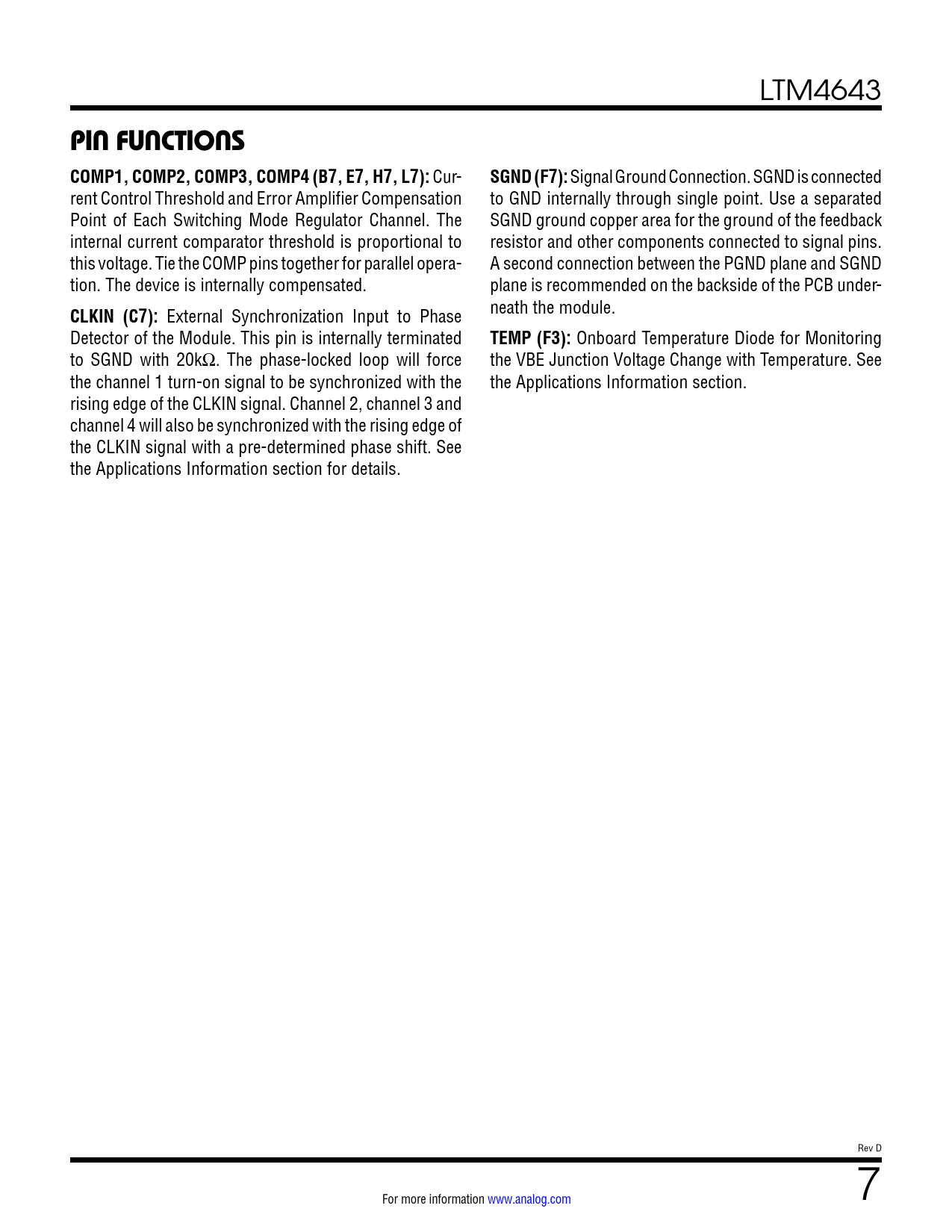 PIN FUNCTIONS COMP1, COMP2, COMP3, COMP4 (B7, E7, H7, L7):. SGND (F7):. CLKIN (C7):. TEMP (F3):