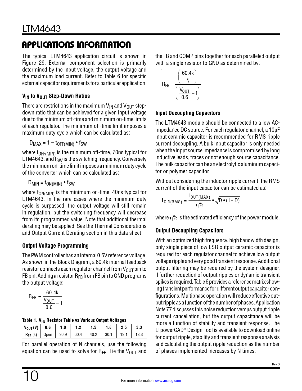 APPLICATIONS INFORMATION. IN to VOUT Step-Down Ratios. Input Decoupling Capacitors. Output Decoupling Capacitors