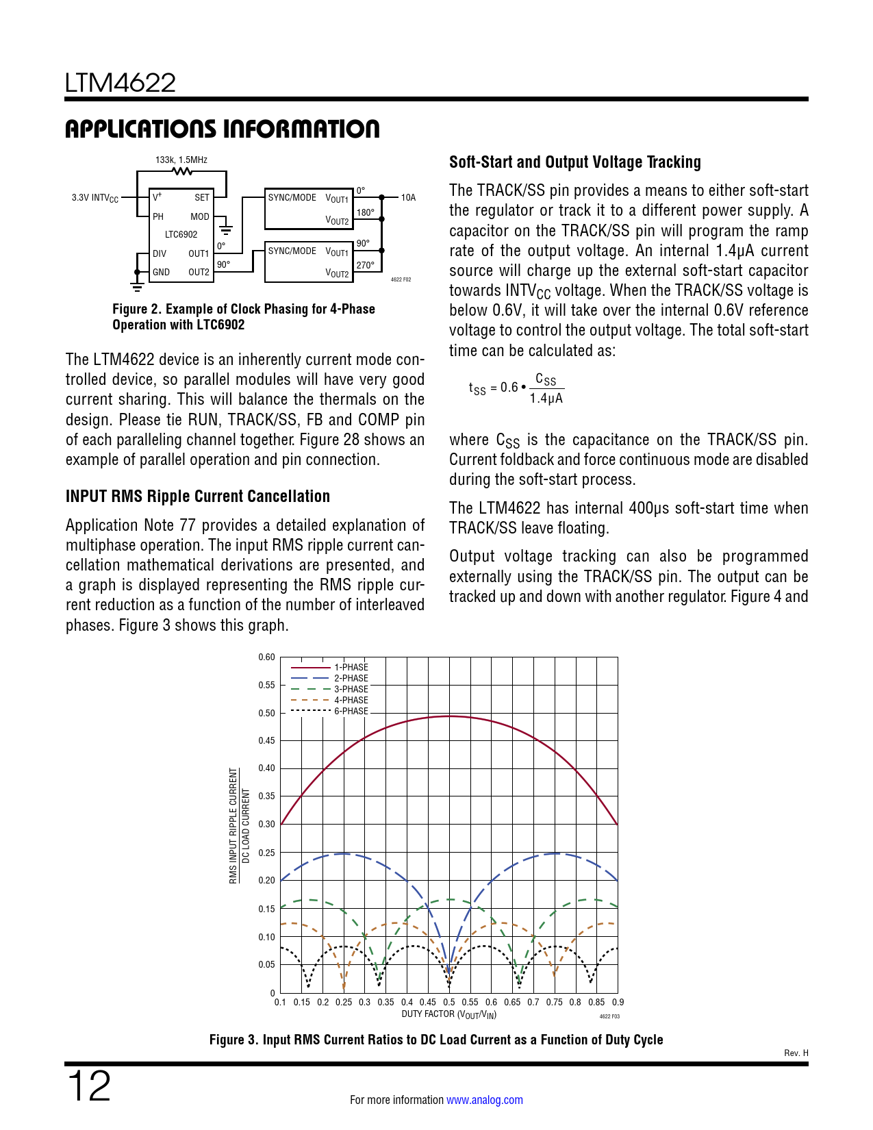 The LTM4622 has internal 400μs soft-start time when Application Note 77 provides a detailed explanation of TRACK/SS leave floating. multiphase operation. The input RMS ripple current can- cellation mathematical derivations are presented, and Output voltage tracking can also be programmed a graph is displayed representing the RMS ripple cur- externally using the TRACK/SS pin. The output can be rent reduction as a function of the number of interleaved tracked up and down with another regulator. Figure 4 and phases. Figure 3 shows this graph. 0.60 1-PHASE 2-PHASE 0.55 3-PHASE 4-PHASE 0.50 6-PHASE 0.45 0.40 0.35 0.30 0.25 DC LOAD CURRENT RMS INPUT RIPPLE CURRENT 0.20 0.15 0.10 0.05 00.1 0.15 0.2 0.25 0.3 0.35 0.4 0.45 0.5 0.55 0.6 0.65 0.7 0.75 0.8 0.85 0.9 DUTY FACTOR (VOUT/VIN) 4622 F03