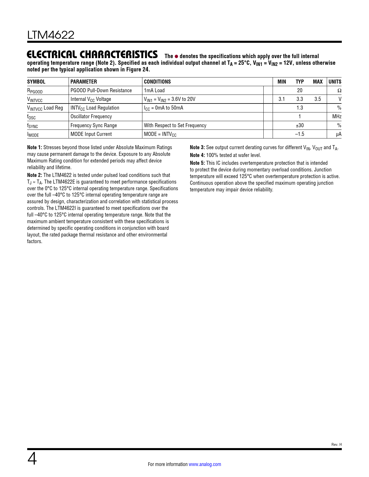 The LTM4622 is tested under pulsed load conditions such that temperature will exceed 125°C when overtemperature protection is active. TJ ≈ TA. The LTM4622E is guaranteed to meet performance specifications Continuous operation above the specified maximum operating junction over the 0°C to 125°C internal operating temperature range. Specifications temperature may impair device reliability. over the full –40°C to 125°C internal operating temperature range are assured by design, characterization and correlation with statistical process controls. The LTM4622I is guaranteed to meet specifications over the full –40°C to 125°C internal operating temperature range. Note that the maximum ambient temperature consistent with these specifications is determined by specific operating conditions in conjunction with board layout, the rated package thermal resistance and other environmental factors. Rev. H 4 For more information www.analog.com Document Outline Features Applications Typical Application Description Absolute Maximum Ratings Pin Configuration Order Information Electrical Characteristics Typical Performance Characteristics Pin Functions Block Diagram Decoupling Requirements Operation Applications Information Safety Considerations Layout Checklist/Example Package Description Revision History Package Photo Design Resources Related Parts