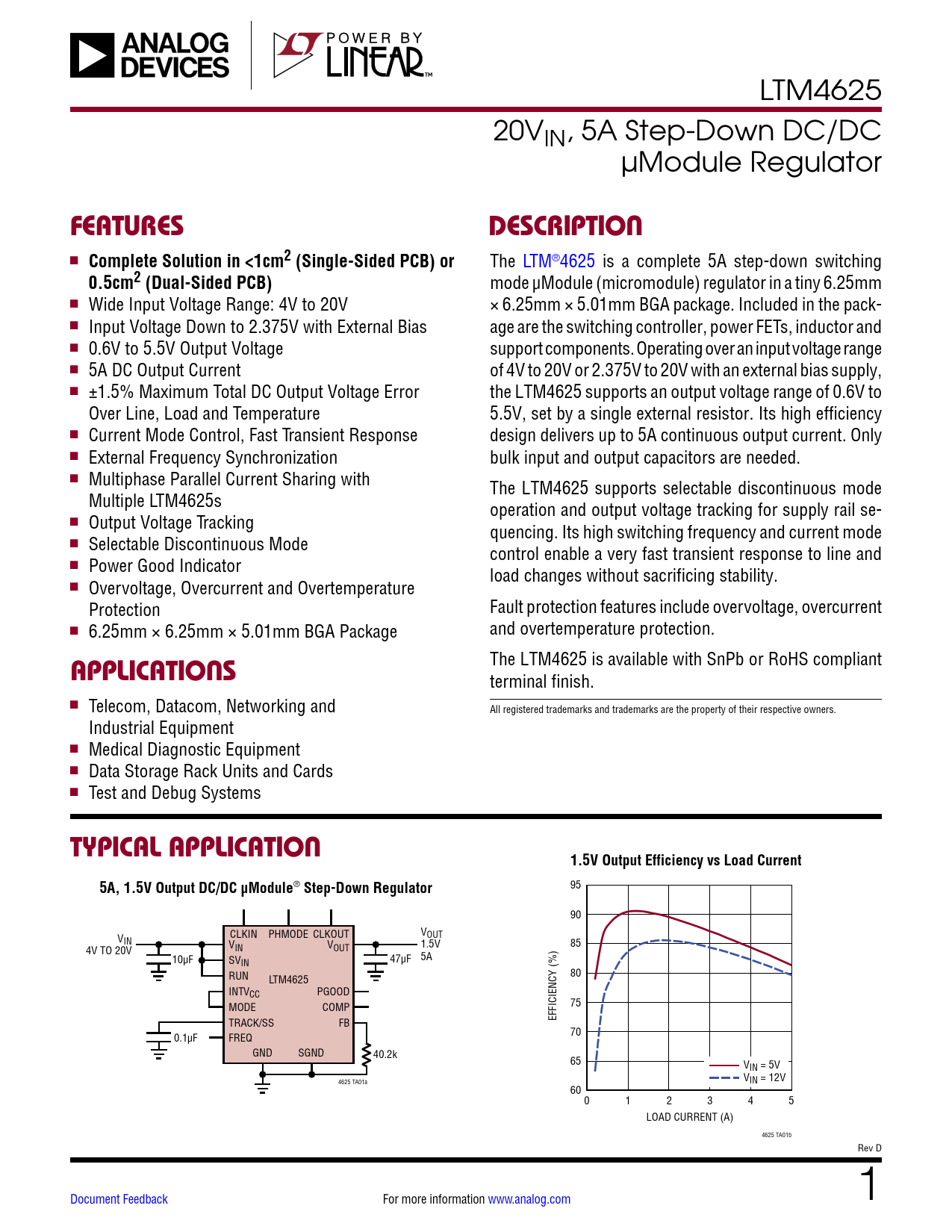 LTM4625 20VIN, 5A Step-Down DC/DC µModule Regulator FEATURESDESCRIPTION n Complete Solution in <1cm2 (Single-Sided PCB) or The LTM®4625 is a complete 5A step-down switching 0.5cm2 (Dual-Sided PCB) mode µModule (micromodule) regulator in a tiny 6.25mm n Wide Input Voltage Range: 4V to 20V × 6.25mm × 5.01mm BGA package. Included in the pack- n Input Voltage Down to 2.375V with External Bias age are the switching controller, power FETs, inductor and n 0.6V to 5.5V Output Voltage support components. Operating over an input voltage range n 5A DC Output Current of 4V to 20V or 2.375V to 20V with an external bias supply, n ±1.5% Maximum Total DC Output Voltage Error the LTM4625 supports an output voltage range of 0.6V to Over Line, Load and Temperature 5.5V, set by a single external resistor. Its high efficiency n Current Mode Control, Fast Transient Response design delivers up to 5A continuous output current. Only n External Frequency Synchronization bulk input and output capacitors are needed. n Multiphase Parallel Current Sharing with The LTM4625 supports selectable discontinuous mode Multiple LTM4625s operation and output voltage tracking for supply rail se- n Output Voltage Tracking quencing. Its high switching frequency and current mode n Selectable Discontinuous Mode control enable a very fast transient response to line and n Power Good Indicator load changes without sacrificing stability. n Overvoltage, Overcurrent and Overtemperature Protection Fault protection features include overvoltage, overcurrent n 6.25mm × 6.25mm × 5.01mm BGA Package and overtemperature protection. The LTM4625 is available with SnPb or RoHS compliant APPLICATIONS terminal finish. n Telecom, Datacom, Networking and All registered trademarks and trademarks are the property of their respective owners. Industrial Equipment n Medical Diagnostic Equipment n Data Storage Rack Units and Cards n Test and Debug Systems TYPICAL APPLICATION1.5V Output Efficiency vs Load Current5A, 1.5V Output DC/DC µModule ® Step-Down Regulator 95 90 V CLKIN PHMODE CLKOUT VOUT IN 85 4V TO 20V V V 1.5V IN OUT 10µF SV 47µF 5A IN RUN LTM4625 80 INTVCC PGOOD MODE COMP 75 TRACK/SS FB EFFICIENCY (%) 0.1µF FREQ 70 GND SGND 40.2k 65 VIN = 5V V 4625 TA01a IN = 12V 60 0 1 2 3 4 5 LOAD CURRENT (A) 4625 TA01b Rev D Document Feedback For more information www.analog.com 1 Document Outline Features Applications Description Typical Application Absolute Maximum Ratings Pin Configuration Order Information Electrical Characteristics Typical Performance Characteristics Pin Functions Block Diagram Decoupling Requirements Operation Applications Information Package Description Revision History Package Photo Design Resources Related Parts