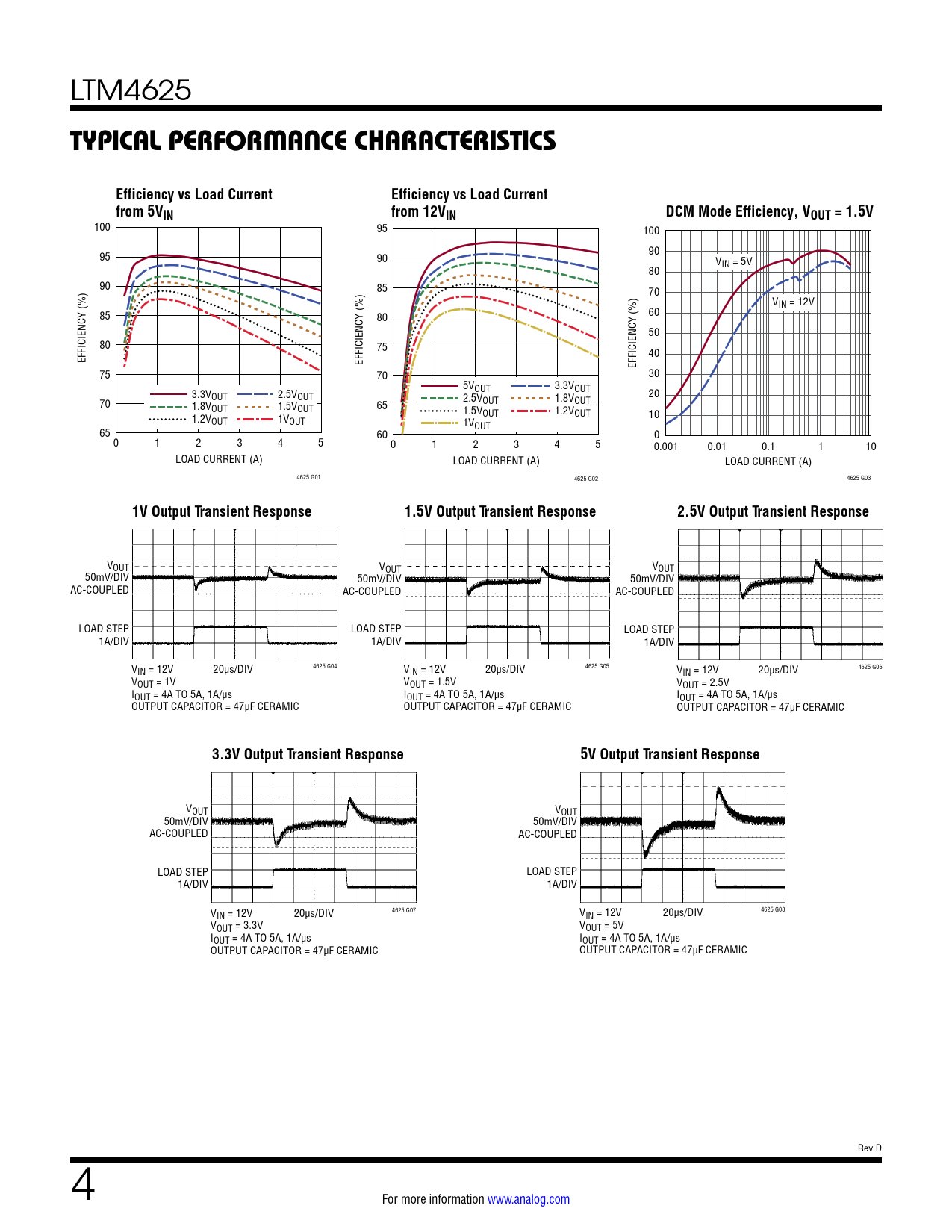 VOUT VOUT VOUT 50mV/DIV 50mV/DIV 50mV/DIV AC-COUPLED AC-COUPLED AC-COUPLED LOAD STEP LOAD STEP LOAD STEP 1A/DIV 1A/DIV 1A/DIV VIN = 12V 20µs/DIV 4625 G04 VIN = 12V 20µs/DIV 4625 G05 VIN = 12V 20µs/DIV 4625 G06 VOUT = 1V VOUT = 1.5V VOUT = 2.5V IOUT = 4A TO 5A, 1A/µs IOUT = 4A TO 5A, 1A/µs IOUT = 4A TO 5A, 1A/µs OUTPUT CAPACITOR = 47µF CERAMIC OUTPUT CAPACITOR = 47µF CERAMIC OUTPUT CAPACITOR = 47µF CERAMIC