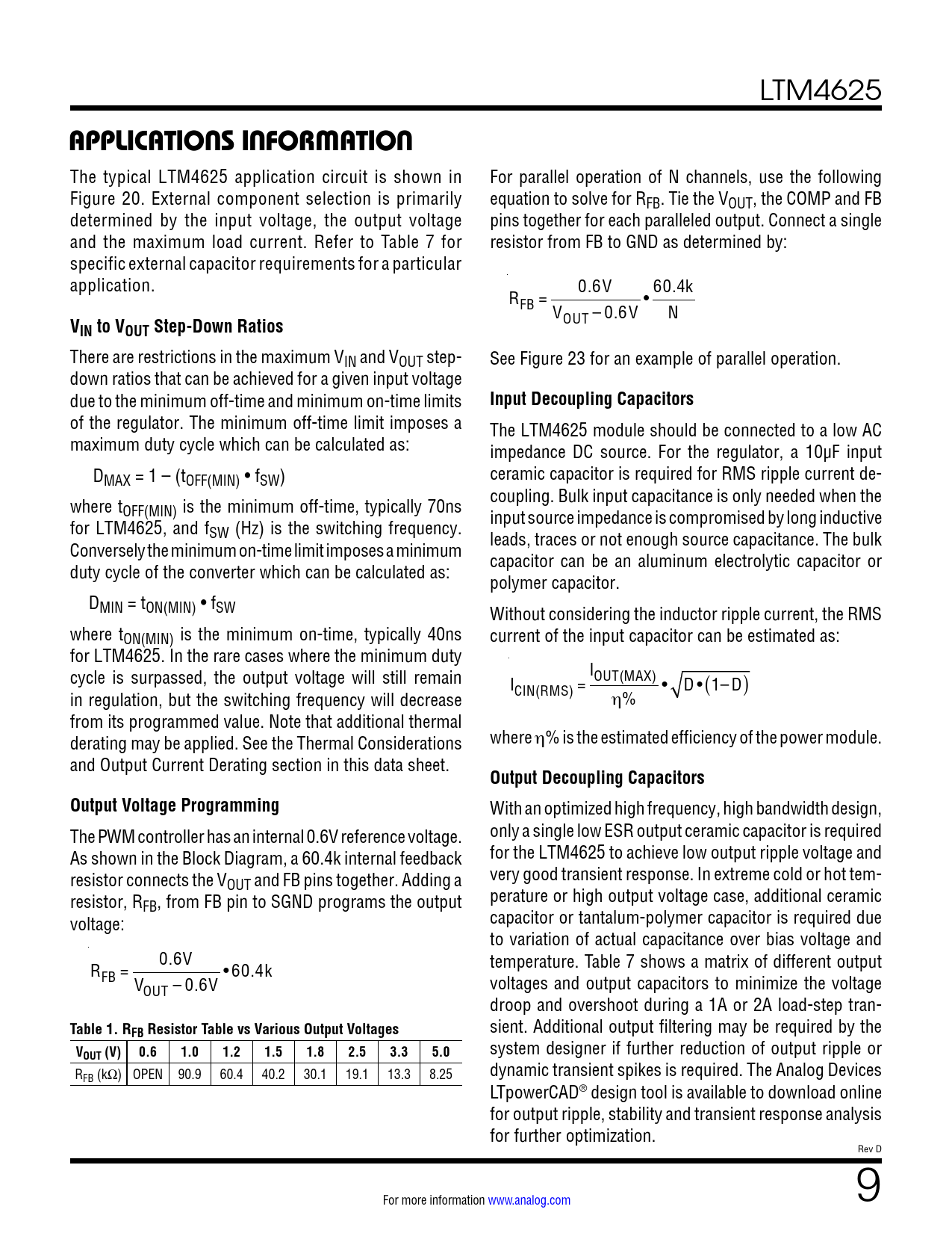 The typical LTM4625 application circuit is shown in For parallel operation of N channels, use the following Figure 20. External component selection is primarily equation to solve for RFB. Tie the VOUT, the COMP and FB determined by the input voltage, the output voltage pins together for each paralleled output. Connect a single and the maximum load current. Refer to Table 7 for resistor from FB to GND as determined by: specific external capacitor requirements for a particular application. 0.6V 60.4k RFB = • V N