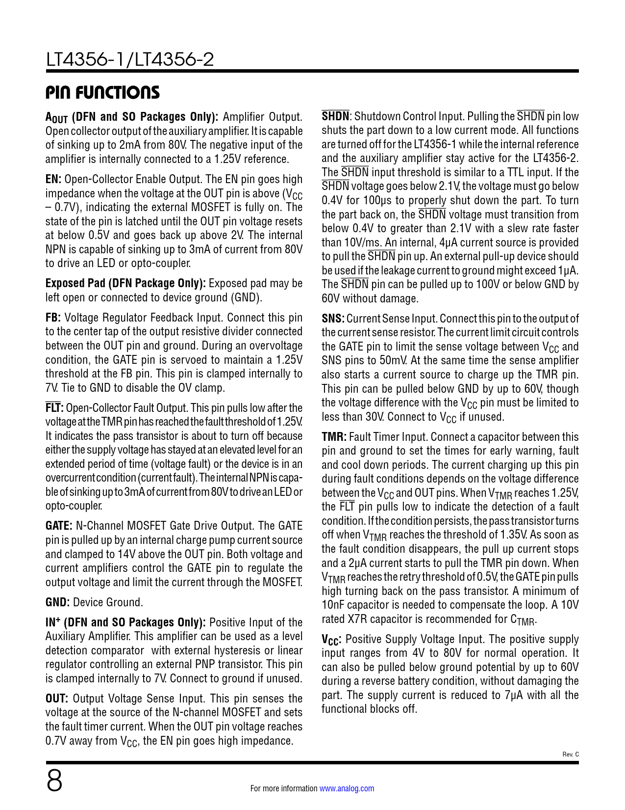 LT4356-1/LT4356-2 PIN FUNCTIONSAOUT (DFN and SO Packages Only): Amplifier Output. SHDN : Shutdown Control Input. Pulling the SHDN pin low Open collector output of the auxiliary amplifier. It is capable shuts the part down to a low current mode. All functions of sinking up to 2mA from 80V. The negative input of the are turned off for the LT4356-1 while the internal reference amplifier is internally connected to a 1.25V reference. and the auxiliary amplifier stay active for the LT4356-2. EN: Open-Collector Enable Output. The EN pin goes high The SHDN input threshold is similar to a TTL input. If the impedance when the voltage at the OUT pin is above (V SHDN voltage goes below 2.1V, the voltage must go below CC – 0.7V), indicating the external MOSFET is fully on. The 0.4V for 100μs to properly shut down the part. To turn state of the pin is latched until the OUT pin voltage resets the part back on, the SHDN voltage must transition from at below 0.5V and goes back up above 2V. The internal below 0.4V to greater than 2.1V with a slew rate faster NPN is capable of sinking up to 3mA of current from 80V than 10V/ms. An internal, 4μA current source is provided to drive an LED or opto-coupler. to pull the SHDN pin up. An external pull-up device should be used if the leakage current to ground might exceed 1μA. Exposed Pad (DFN Package Only): Exposed pad may be The SHDN pin can be pulled up to 100V or below GND by left open or connected to device ground (GND). 60V without damage. FB: Voltage Regulator Feedback Input. Connect this pin SNS: Current Sense Input. Connect this pin to the output of to the center tap of the output resistive divider connected the current sense resistor. The current limit circuit controls between the OUT pin and ground. During an overvoltage the GATE pin to limit the sense voltage between VCC and condition, the GATE pin is servoed to maintain a 1.25V SNS pins to 50mV. At the same time the sense amplifier threshold at the FB pin. This pin is clamped internally to also starts a current source to charge up the TMR pin. 7V. Tie to GND to disable the OV clamp. This pin can be pulled below GND by up to 60V, though FLT: Open-Collector Fault Output. This pin pulls low after the the voltage difference with the VCC pin must be limited to voltage at the TMR pin has reached the fault threshold of 1.25V. less than 30V. Connect to VCC if unused. It indicates the pass transistor is about to turn off because TMR: Fault Timer Input. Connect a capacitor between this either the supply voltage has stayed at an elevated level for an pin and ground to set the times for early warning, fault extended period of time (voltage fault) or the device is in an and cool down periods. The current charging up this pin overcurrent condition (current fault). The internal NPN is capa- during fault conditions depends on the voltage difference ble of sinking up to 3mA of current from 80V to drive an LED or between the VCC and OUT pins. When VTMR reaches 1.25V, opto-coupler. the FLT pin pulls low to indicate the detection of a fault GATE: N-Channel MOSFET Gate Drive Output. The GATE condition. If the condition persists, the pass transistor turns pin is pulled up by an internal charge pump current source off when VTMR reaches the threshold of 1.35V. As soon as and clamped to 14V above the OUT pin. Both voltage and the fault condition disappears, the pull up current stops current amplifiers control the GATE pin to regulate the and a 2µA current starts to pull the TMR pin down. When output voltage and limit the current through the MOSFET. VTMR reaches the retry threshold of 0.5V, the GATE pin pulls high turning back on the pass transistor. A minimum of GND: Device Ground. 10nF capacitor is needed to compensate the loop. A 10V IN+ (DFN and SO Packages Only): Positive Input of the rated X7R capacitor is recommended for CTMR. Auxiliary Amplifier. This amplifier can be used as a level VCC: Positive Supply Voltage Input. The positive supply detection comparator with external hysteresis or linear input ranges from 4V to 80V for normal operation. It regulator controlling an external PNP transistor. This pin can also be pulled below ground potential by up to 60V is clamped internally to 7V. Connect to ground if unused. during a reverse battery condition, without damaging the OUT: Output Voltage Sense Input. This pin senses the part. The supply current is reduced to 7µA with all the voltage at the source of the N-channel MOSFET and sets functional blocks off. the fault timer current. When the OUT pin voltage reaches 0.7V away from VCC, the EN pin goes high impedance. Rev. C 8 For more information www.analog.com Document Outline Features Applications Typical Application Description Absolute Maximum Ratings Pin Configuration Order Information Electrical Characteristics Typical Performance Characteristics Pin Functions Block Diagram Operation Applications Information Typical Applications Package Description Revision History Typical Application Related Parts