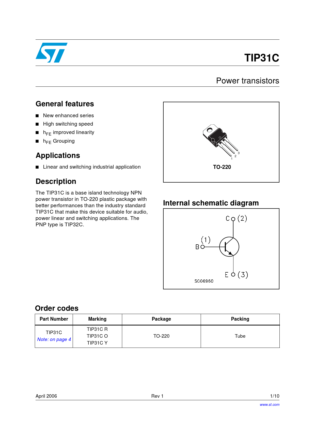 TIP31C R TIP31C TIP31C O TO-220 Tube Note: on page 4 TIP31C Y April 2006 Rev 1 1/10 www.st.com 10