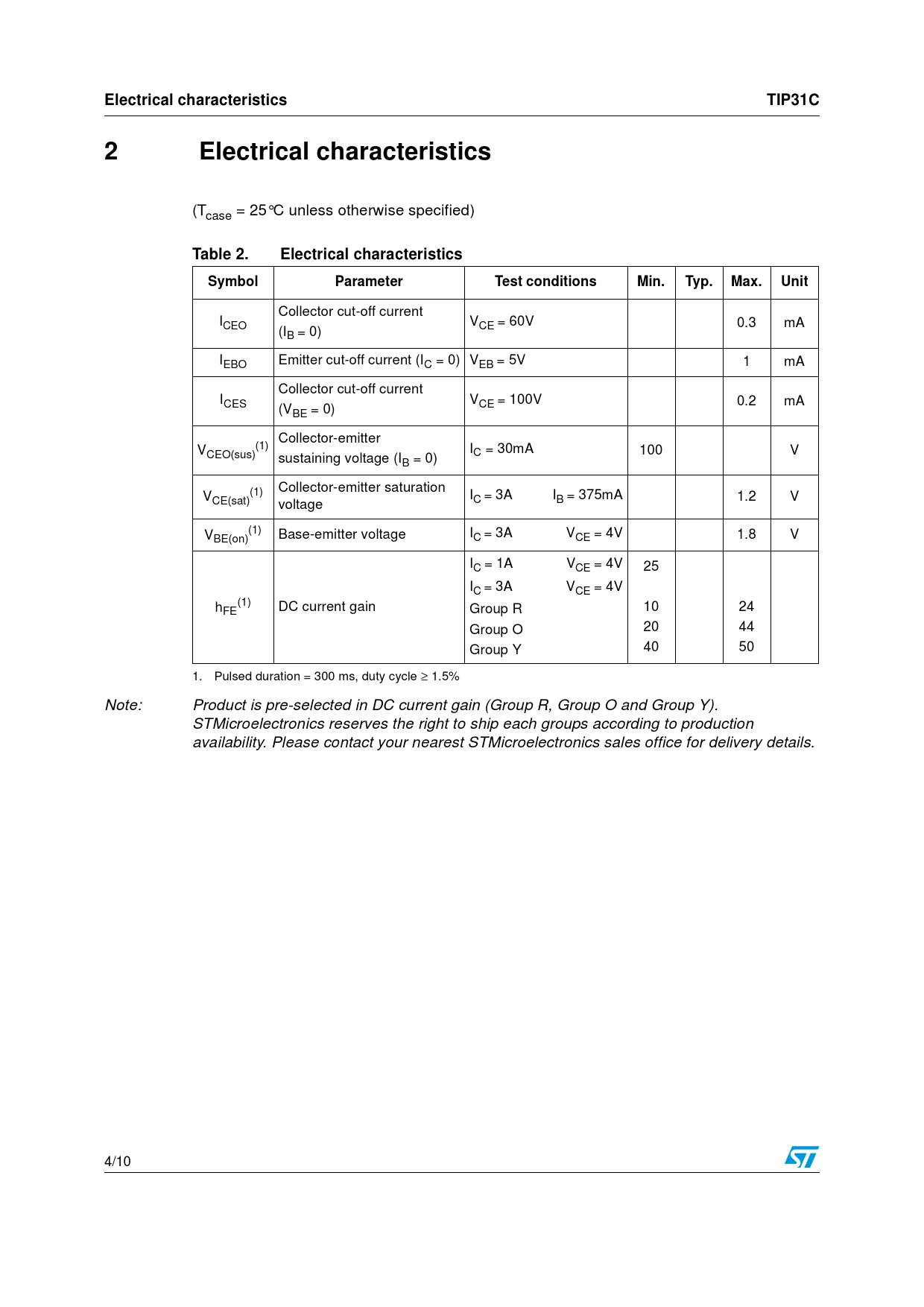 Pages / Page10 / 4 — Electrical characteristics. TIP31C. Electrical. characteristics. Table 2. …