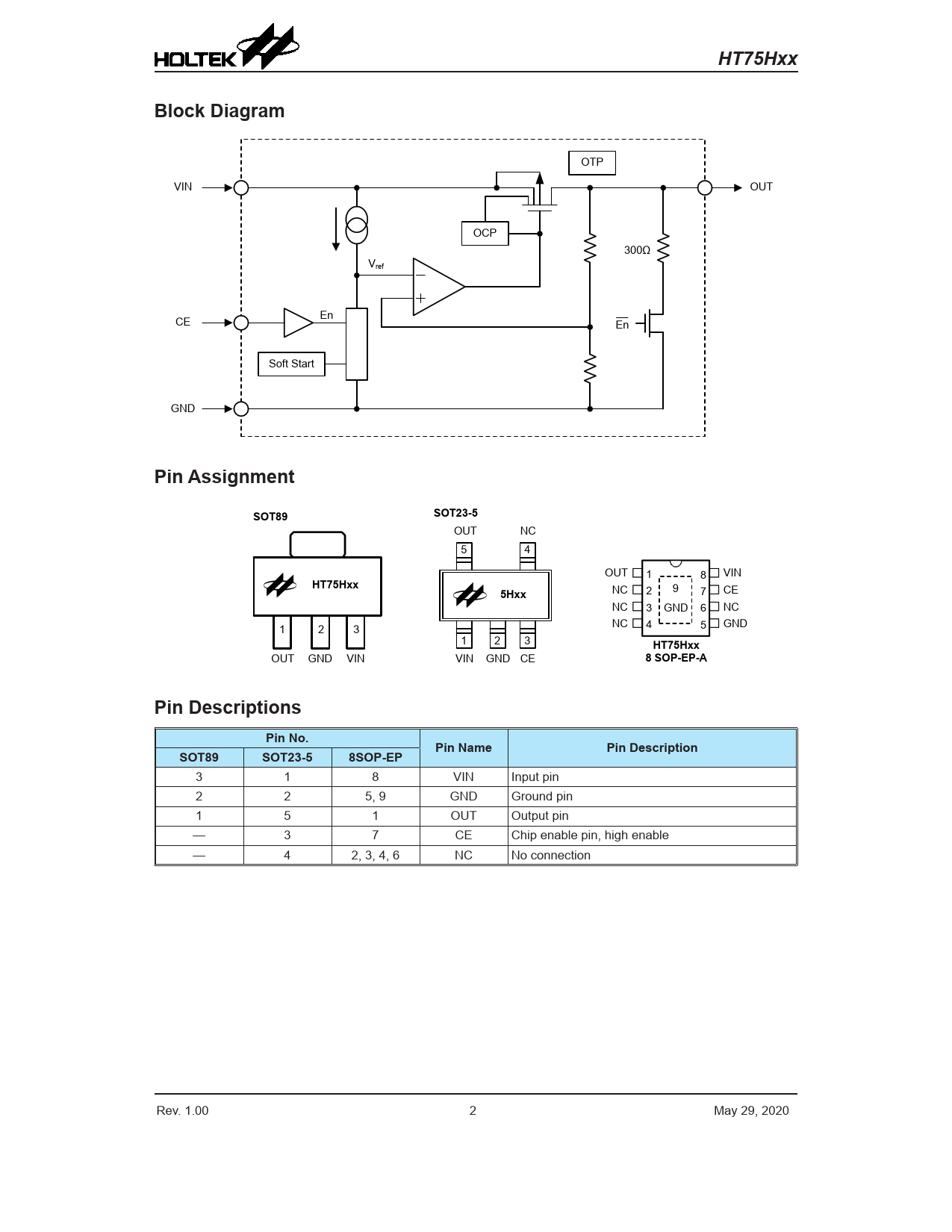 HT75Hxx. Block Diagram. Pin Assignment. SOT89. SOT23-5. 5Hxx. 8 SOP-EP-A. Pin Descriptions. Pin No. Pin Name. Pin Description. 8SOP-EP