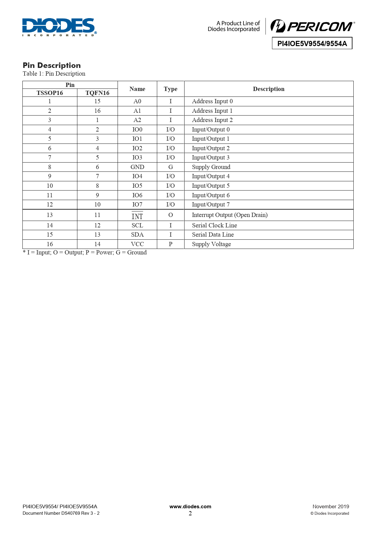 PI4IOE5V9554/9554A. Pin Description. Pin. Name. Type. Description. TSSOP16. TQFN16. www.diodes.com