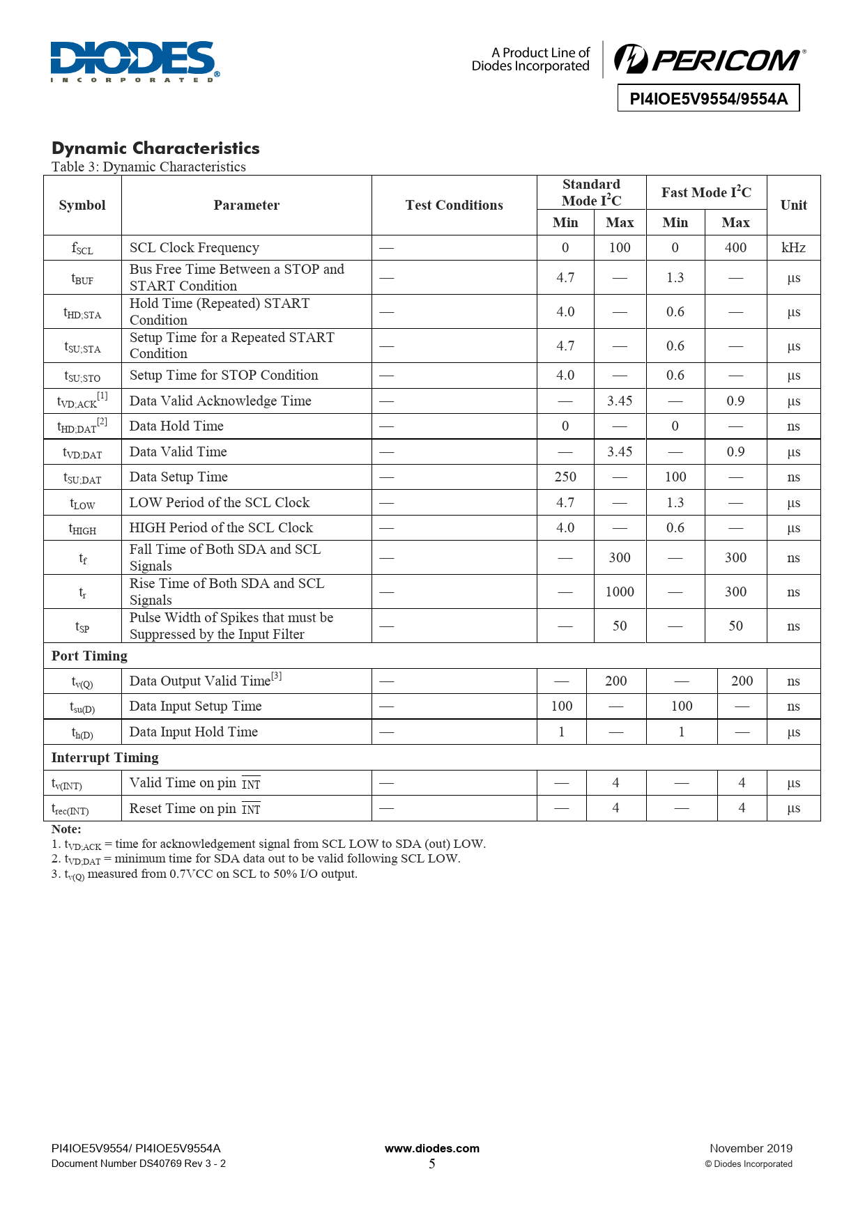 PI4IOE5V9554/9554A. Dynamic Characteristics. Standard. Symbol. Parameter. Test Conditions. Mode I2C. Fast Mode I2C. Unit. Min. Max