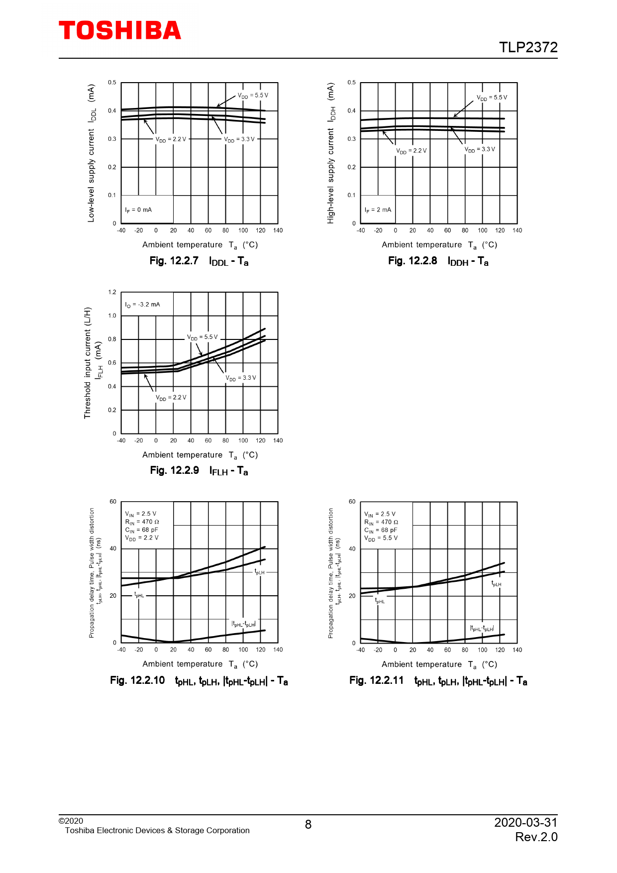 TLP2372. Fig. 12.2.7. IDDL. -. Ta. Fig. 12.2.8. IDDH. -. Ta. Fig. 12.2.9. IFLH. -. Ta. Fig. 12.2.10. tpHL,. tpLH,. |tpHL-tpLH|. -. Ta. Fig. 12.2.11. tpHL,. tpLH,