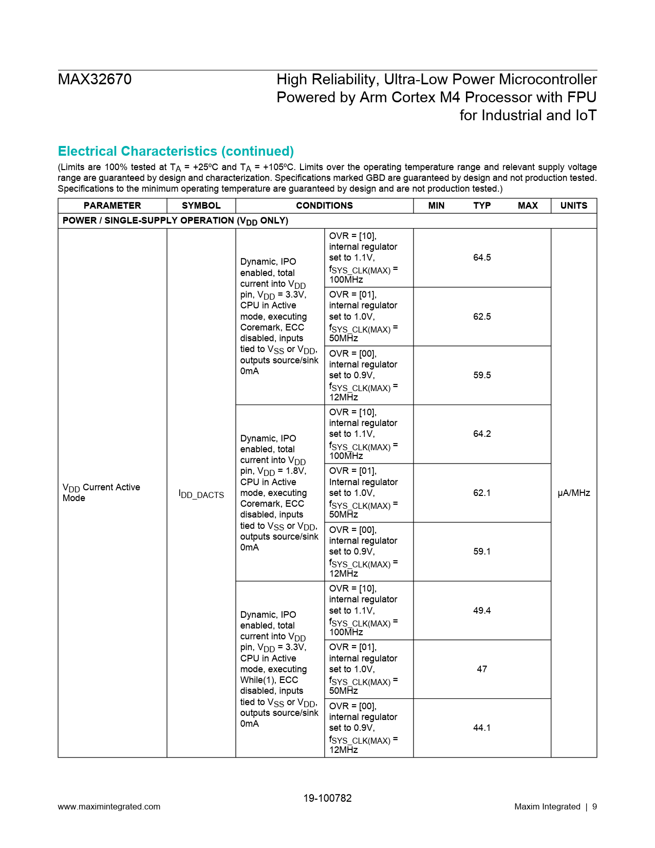 MAX32670 High Reliability, Ultra-Low Power Microcontroller Powered by Arm Cortex M4 Processor with FPU for Industrial and IoT Electrical Characteristics (continued) (Limits are 100% tested at TA = +25ºC and TA = +105ºC. Limits over the operating temperature range and relevant supply voltage range are guaranteed by design and characterization. Specifications marked GBD are guaranteed by design and not production tested. Specifications to the minimum operating temperature are guaranteed by design and are not production tested.) PARAMETERSYMBOLCONDITIONSMINTYPMAXUNITSPOWER / SINGLE-SUPPLY OPERATION (VDD ONLY) OVR = [10], internal regulator Dynamic, IPO set to 1.1V, 64.5 enabled, total fSYS_CLK(MAX) = current into V 100MHz DD pin, VDD = 3.3V, OVR = [01], CPU in Active internal regulator mode, executing set to 1.0V, 62.5 Coremark, ECC fSYS_CLK(MAX) = disabled, inputs 50MHz tied to VSS or VDD, OVR = [00], outputs source/sink internal regulator 0mA set to 0.9V, 59.5 fSYS_CLK(MAX) = 12MHz OVR = [10], internal regulator Dynamic, IPO set to 1.1V, 64.2 enabled, total fSYS_CLK(MAX) = current into V 100MHz DD pin, VDD = 1.8V, OVR = [01], CPU in Active Internal regulator VDD Current Active I mode, executing set to 1.0V, 62.1 μA/MHz Mode DD_DACTS Coremark, ECC fSYS_CLK(MAX) = disabled, inputs 50MHz tied to VSS or VDD, OVR = [00], outputs source/sink internal regulator 0mA set to 0.9V, 59.1 fSYS_CLK(MAX) = 12MHz OVR = [10], internal regulator Dynamic, IPO set to 1.1V, 49.4 enabled, total fSYS_CLK(MAX) = current into V 100MHz DD pin, VDD = 3.3V, OVR = [01], CPU in Active internal regulator mode, executing set to 1.0V, 47 While(1), ECC fSYS_CLK(MAX) = disabled, inputs 50MHz tied to VSS or VDD, OVR = [00], outputs source/sink internal regulator 0mA set to 0.9V, 44.1 fSYS_CLK(MAX) = 12MHz 19-100782 www.maximintegrated.com Maxim Integrated | 9 Document Outline General Description Applications Benefits and Features Simplified Block Diagram Absolute Maximum Ratings Package Information 40 TQFN-EP Electrical Characteristics Electrical Characteristics (continued) Electrical Characteristics—SPI Electrical Characteristics—SPI (continued) Electrical Characteristics—I2C Electrical Characteristics—I2C (continued) Electrical Characteristics—I2S Slave Pin Configuration 40 TQFN Pin Description 40 TQFN Detailed Description MAX32670 Arm Cortex-M4 Processor with FPU Engine Memory Internal Flash Memory Internal SRAM Clocking Scheme General-Purpose I/O and Special Function Pins Standard DMA Controller Power Management Power Management Unit Active Mode Sleep Mode DeepSleep Mode Backup Mode Storage Mode Real-Time Clock Windowed Watchdog Timer (WWDT) 32-Bit Timer/Counter/PWM (TMR, LPTMR) Serial Peripherals I2C Interface (I2C) Serial Peripheral Interface (SPI) I2S Interface (I2S) UART (UART, LPUART) Security AES True Random Number Generator (TRNG) CRC Module Secure Boot Debug and Development Interface (SWD) Applications Information Bypass Capacitors Ordering Information Revision History