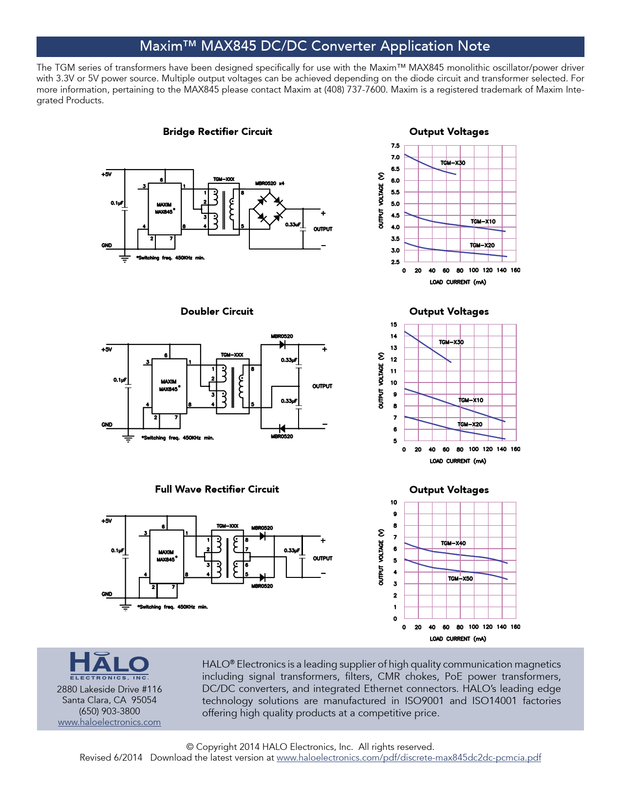 HALO® Electronics is a leading supplier of high quality communication magnetics including signal transformers, filters, CMR chokes, PoE power transformers, 2880 Lakeside Drive #116 DC/DC converters, and integrated Ethernet connectors. HALO’s leading edge Santa Clara, CA 95054 technology solutions are manufactured in ISO9001 and ISO14001 factories (650) 903-3800 offering high quality products at a competitive price. www.haloelectronics.com © Copyright 2014 HALO Electronics, Inc. All rights reserved. Revised 6/2014 Download the latest version at www.haloelectronics.com/pdf/discrete-max845dc2dc-pcmcia.pdf