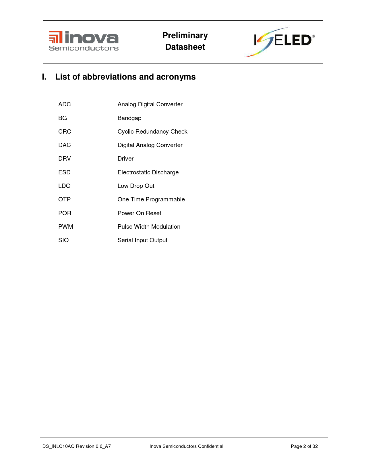 PreliminaryDatasheetI. List of abbreviations and acronyms ADC Analog Digital Converter BG Bandgap CRC Cyclic Redundancy Check DAC Digital Analog Converter DRV Driver ESD Electrostatic Discharge LDO Low Drop Out OTP One Time Programmable POR Power On Reset PWM Pulse Width Modulation SIO Serial Input Output DS_INLC10AQ Revision 0.6_A7 Inova Semiconductors Confidential Page 2 of 32