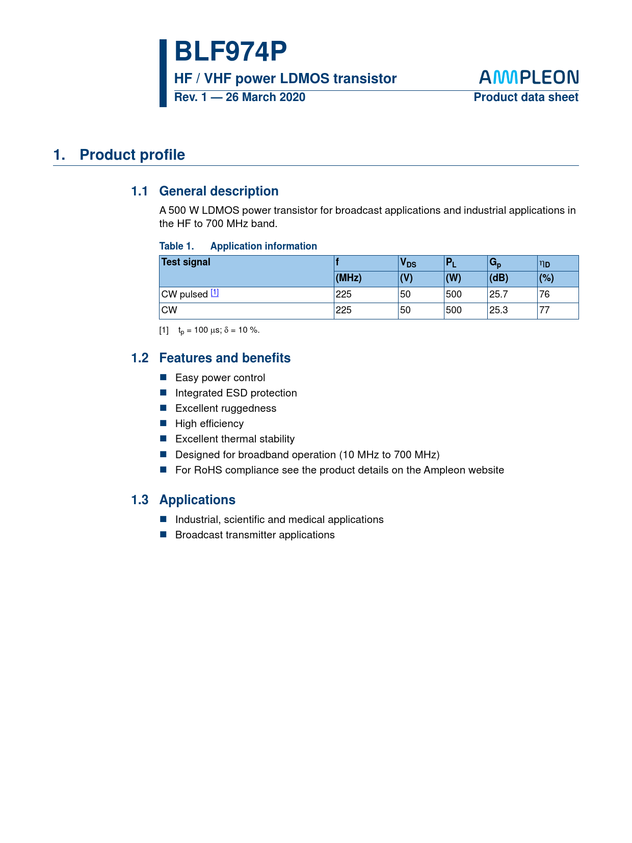 BLF974P HF / VHF power LDMOS transistor. Rev. 1 — 26 March 2020. Product data sheet. 1. Product. profile. 1.1 General description