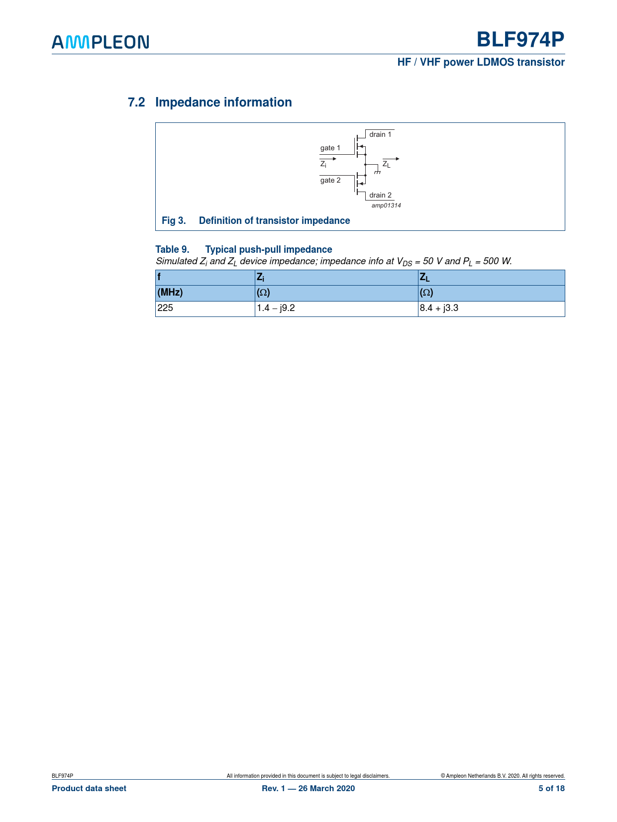 BLF974P. HF / VHF power LDMOS transistor. 7.2 Impedance information. Fig 3. Definition of transistor impedance. Table 9