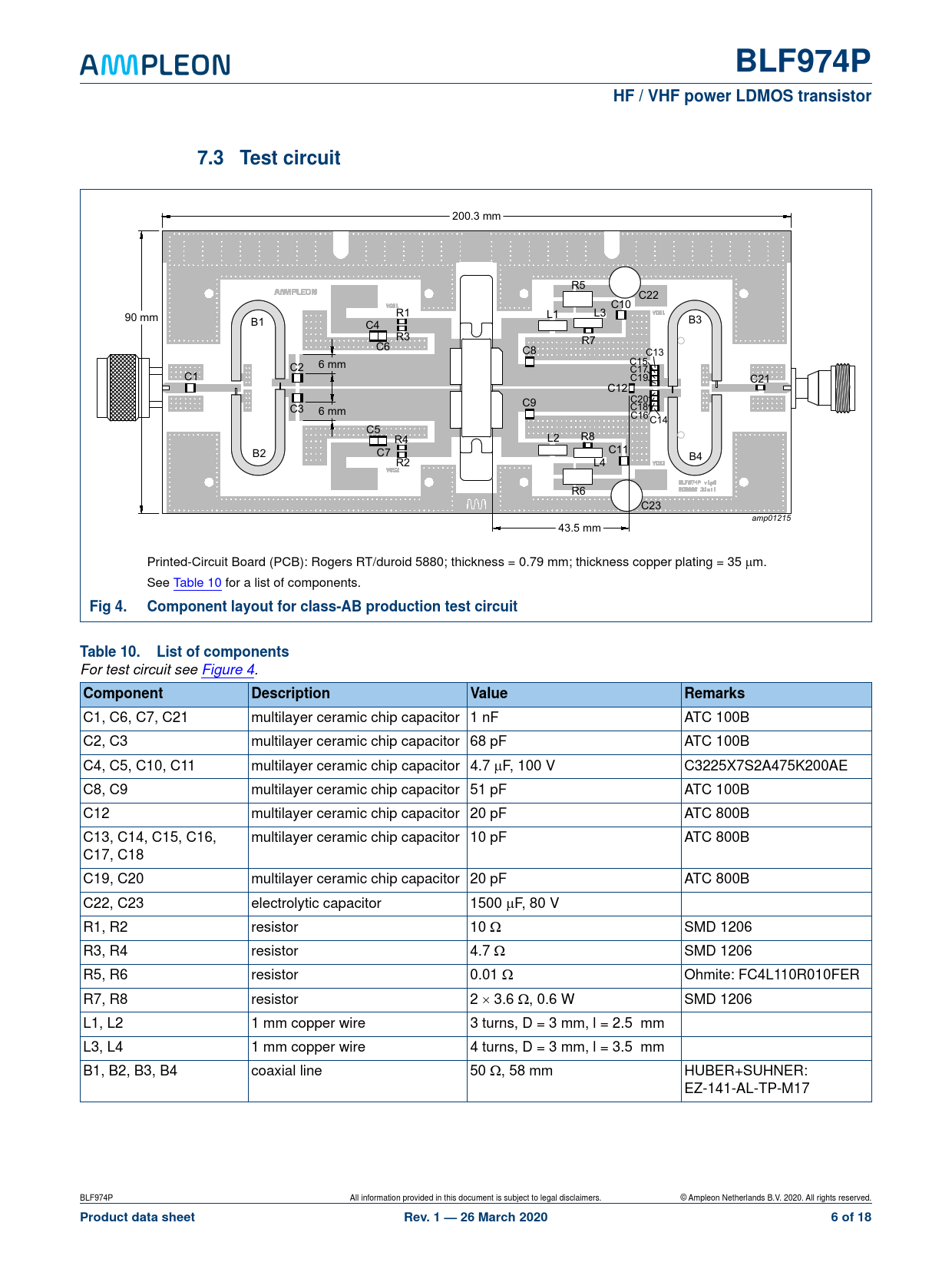 C1, C6, C7, C21 multilayer ceramic chip capacitor 1 nF ATC 100B C2, C3 multilayer ceramic chip capacitor 68 pF ATC 100B C4, C5, C10, C11 multilayer ceramic chip capacitor 4.7 F, 100 V C3225X7S2A475K200AE C8, C9 multilayer ceramic chip capacitor 51 pF ATC 100B C12 multilayer ceramic chip capacitor 20 pF ATC 800B C13, C14, C15, C16, multilayer ceramic chip capacitor 10 pF ATC 800B C17, C18 C19, C20 multilayer ceramic chip capacitor 20 pF ATC 800B C22, C23 electrolytic capacitor 1500 F, 80 V R1, R2 resistor 10 SMD 1206 R3, R4 resistor 4.7 SMD 1206 R5, R6 resistor 0.01 Ohmite: FC4L110R010FER R7, R8 resistor 2 3.6 , 0.6 W SMD 1206 L1, L2 1 mm copper wire 3 turns, D = 3 mm, l = 2.5 mm L3, L4 1 mm copper wire 4 turns, D = 3 mm, l = 3.5 mm B1, B2, B3, B4 coaxial line 50 , 58 mm HUBER+SUHNER: EZ-141-AL-TP-M17 BLF974P All information provided in this document is subject to legal disclaimers. © Ampleon Netherlands B.V. 2020. All rights reserved.