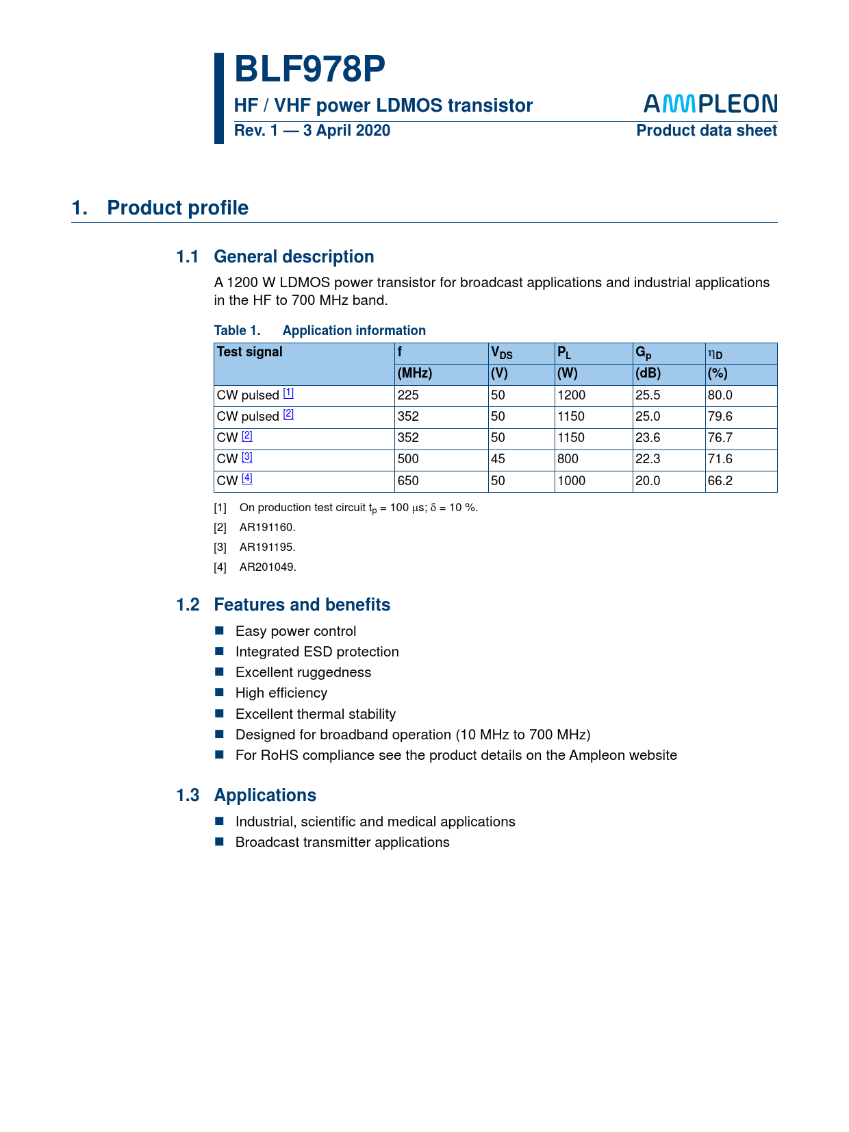 BLF978P HF / VHF power LDMOS transistor. Rev. 1 — 3 April 2020. Product data sheet. 1. Product. profile. 1.1 General description